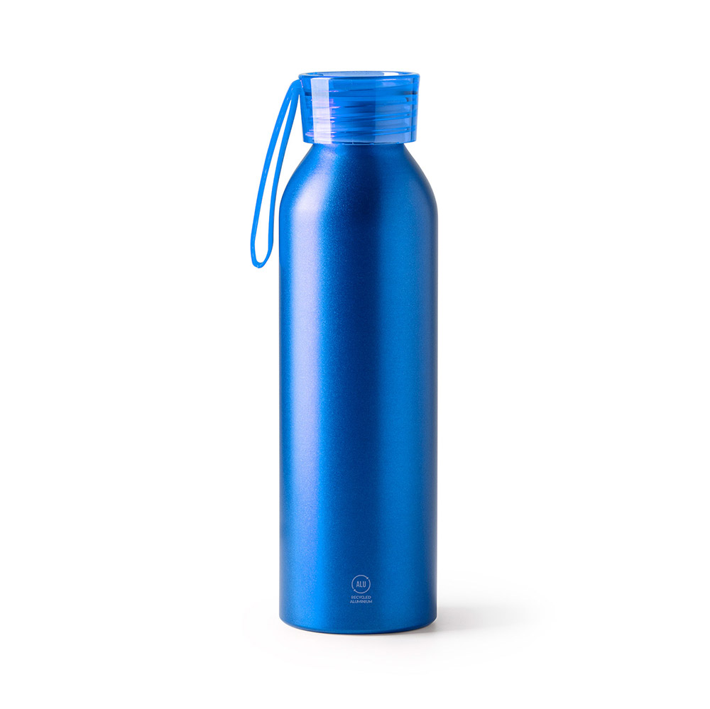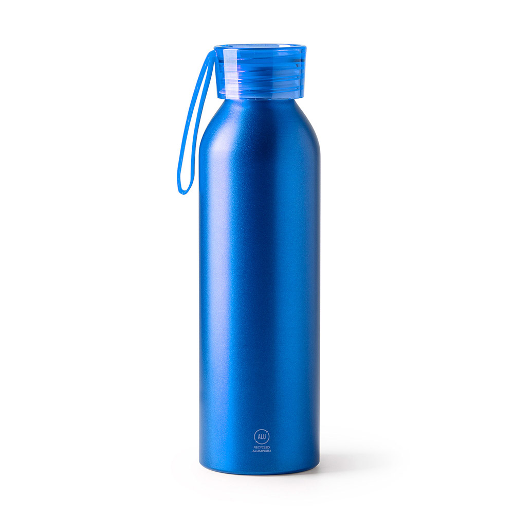 Bidón de aluminio reciclado con tapón y cinta de transporte a juego. Capacidad de 600 ml. Bidón elaborado con material ecológico, concienciado con el medioambiente.