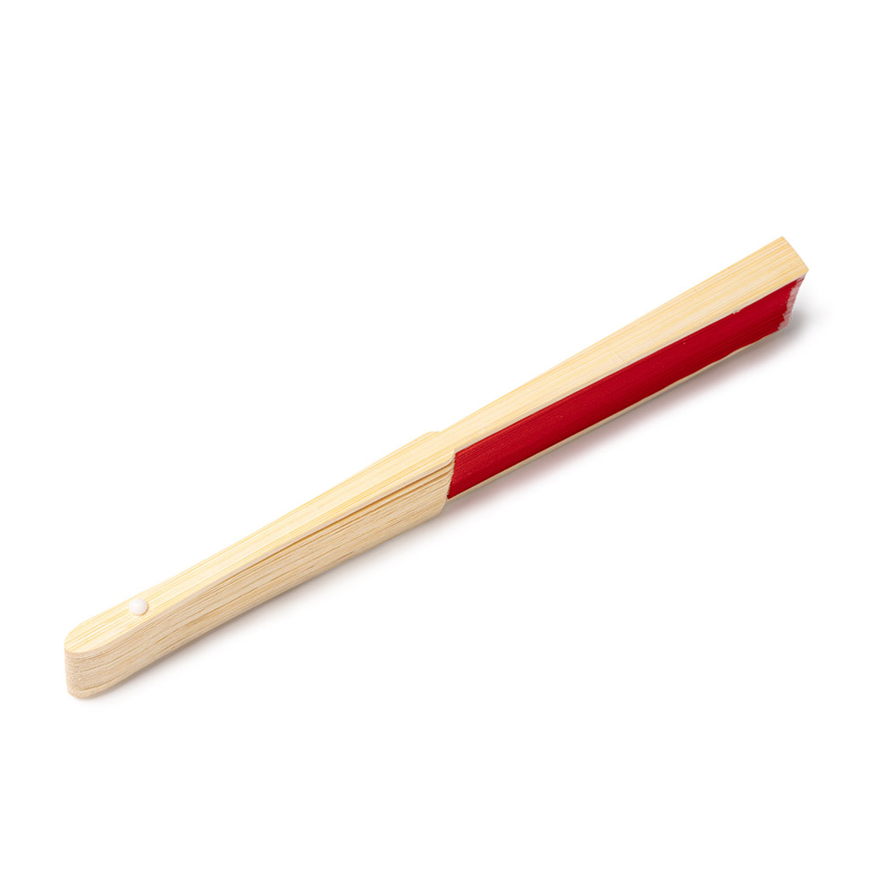 Abanico con varillas de bambú y tela de poliéster.