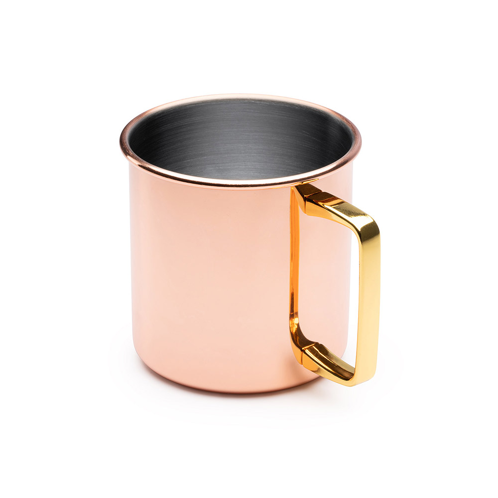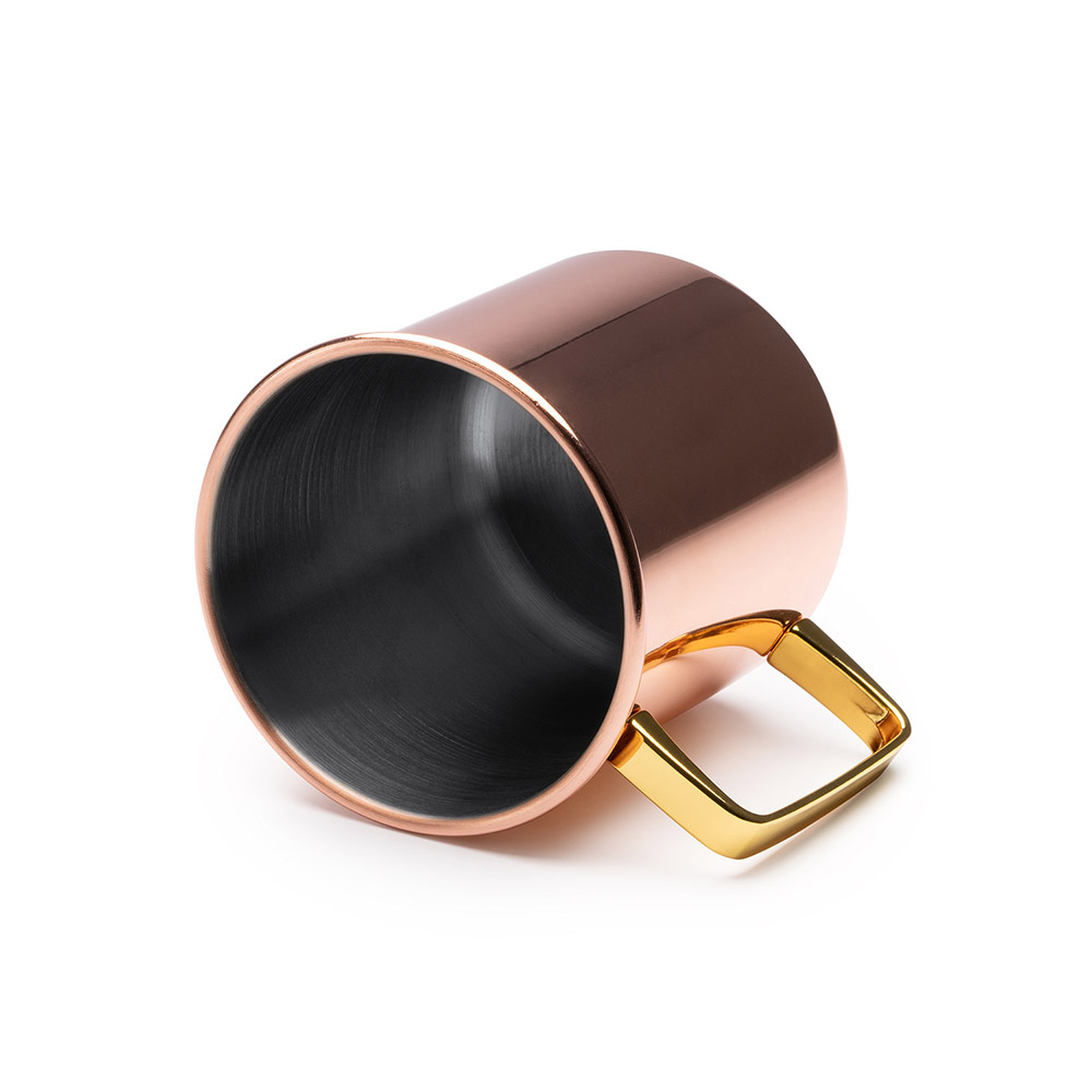 La taza de acero inoxidable con recubrimiento de cobre exterior y asa dorada es una elección elegante y sofisticada para disfrutar de tus bebidas favoritas con una capacidad de 480 ml. El acero inoxidable garantiza su durabilidad y resistencia, mientras que el recubrimiento de cobre exterior le proporciona un aspecto distintivo y elegante.