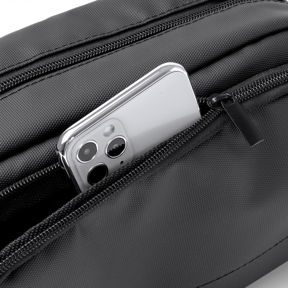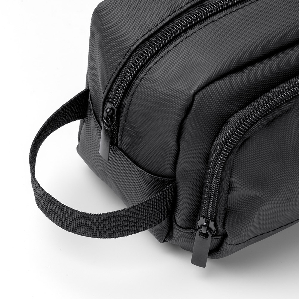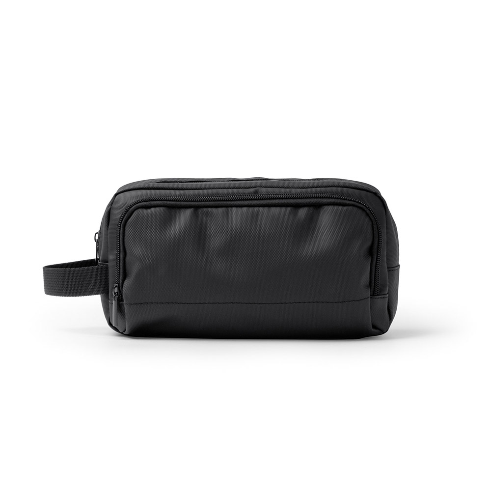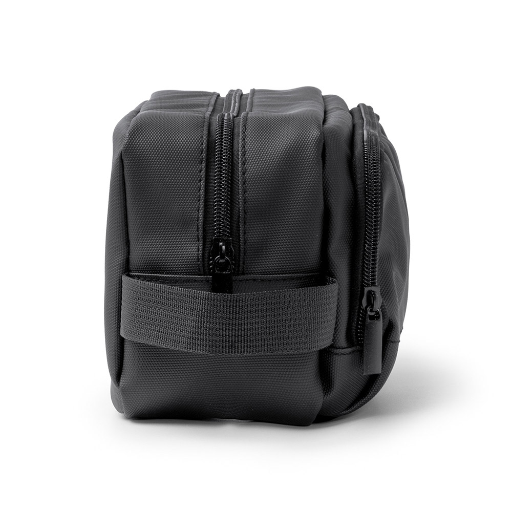 Neceser de PU Leather con doble compartimento y cierre de cremallera, ideal para organizar artículos de aseo personal de manera segura y elegante. Incluye asa de transporte.