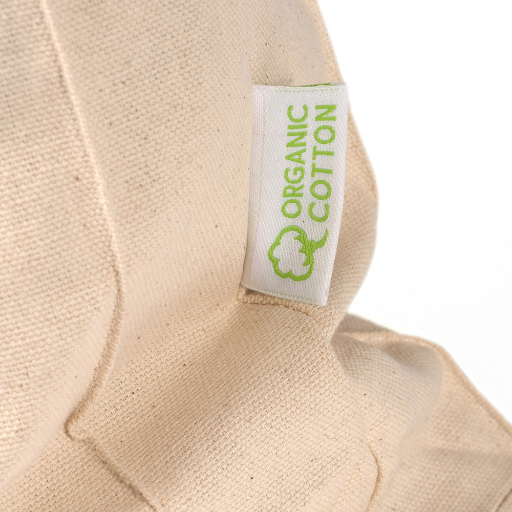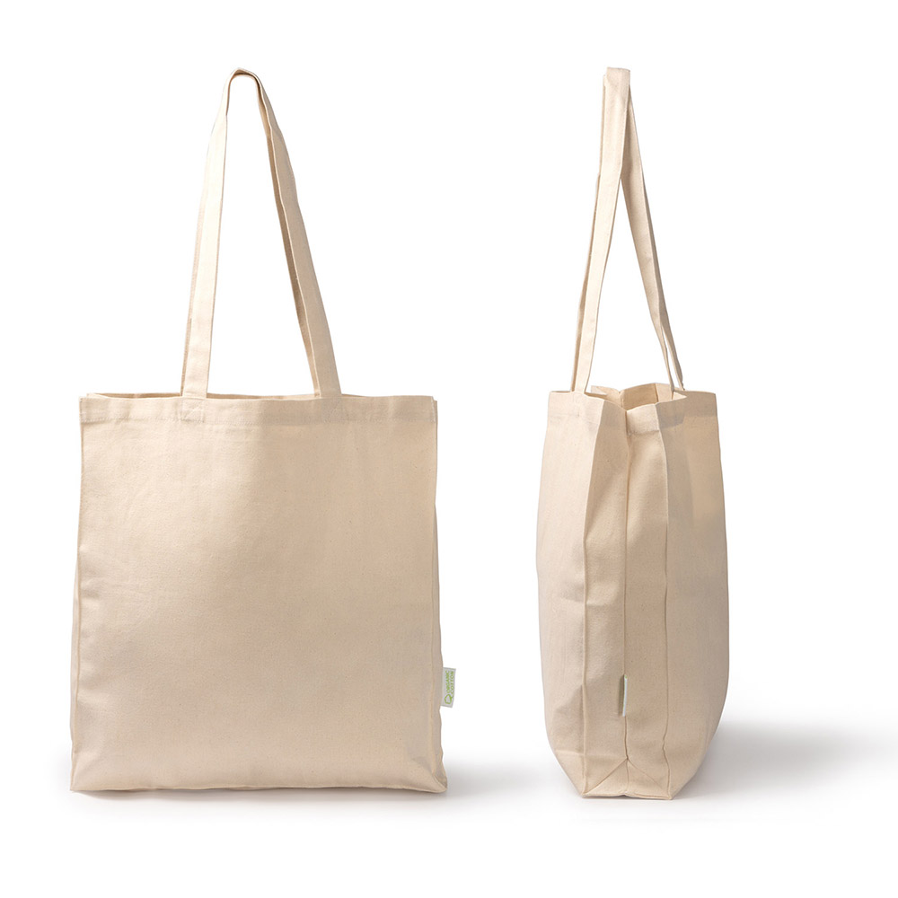 Bolsa 100% algodón orgánico de 220 g/m² con fuelle en la base y laterales en acabado natural. Asas de 70 cm.