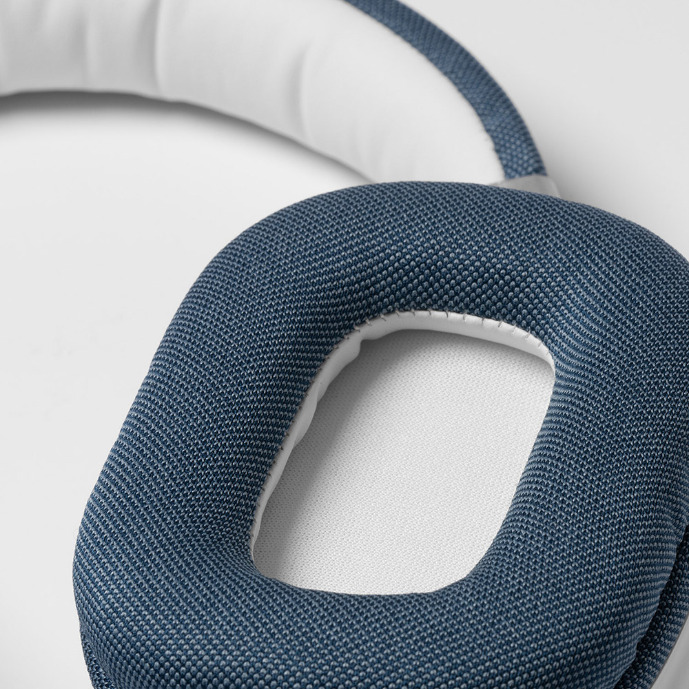 Auriculares inalámbricos con acabado de tela premium, acolchado de polipiel en la parte superior y almohadillas de tela suave.