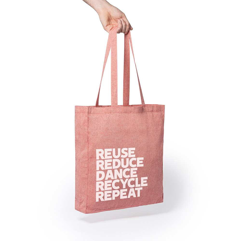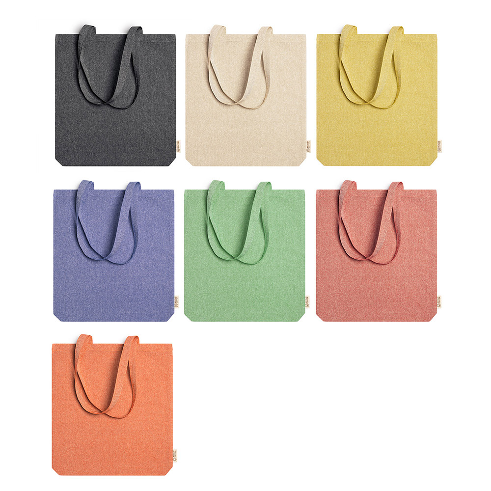 Bolsa realizada en algodón reciclado de 140 g/m² en acabado jaspeado con asas largas de 70 cm.