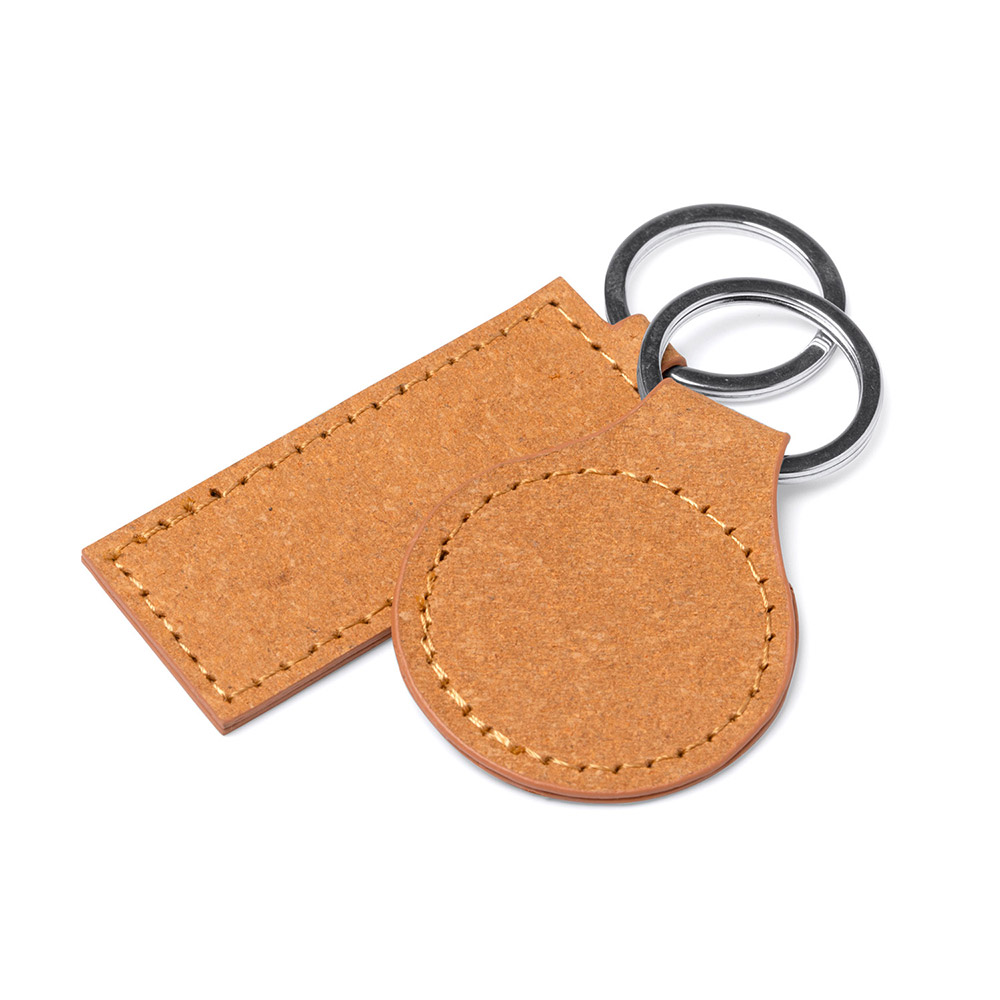 Llavero de piel reciclada en dos formatos con anilla metálica.