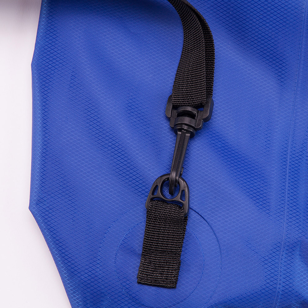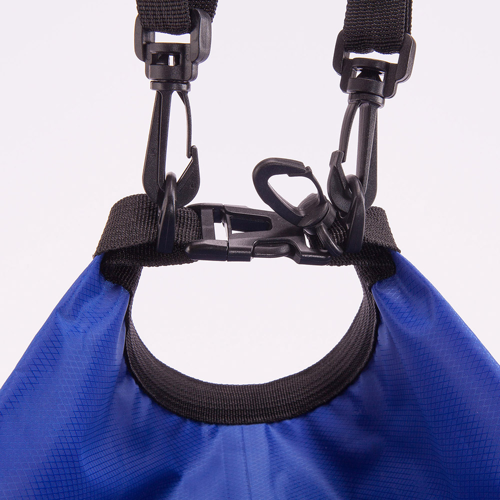 Bolsa impermeable de resistente ripstop. Sistema de cierre estanco con clic. Mosquetón y cinta bandolera ajustable para transporte. Capacidad total: 15 L. Capacidad útil: 10 L.