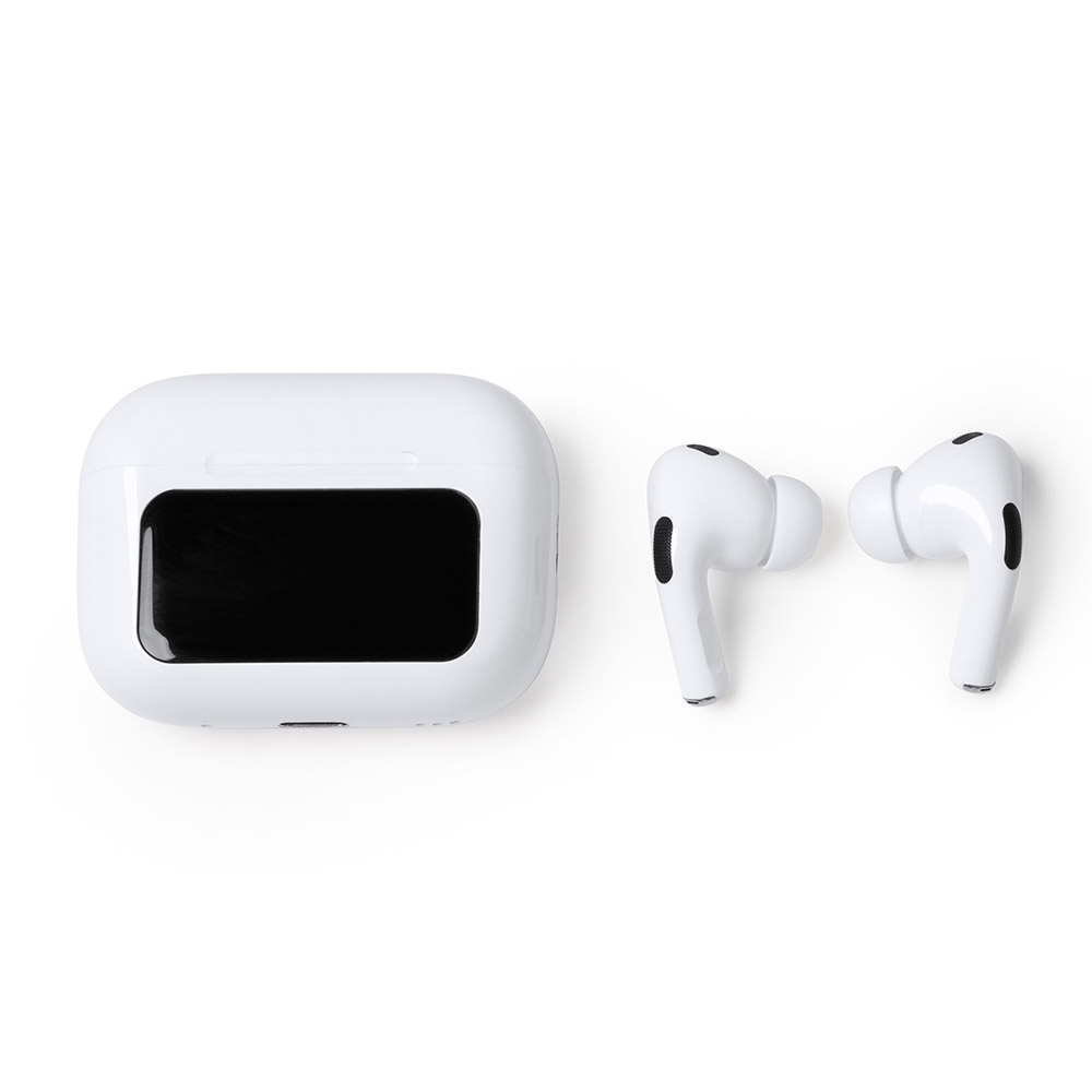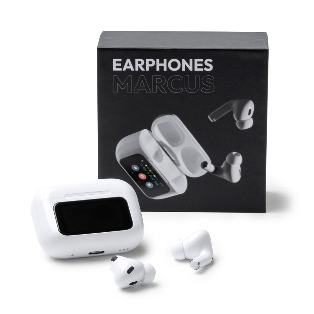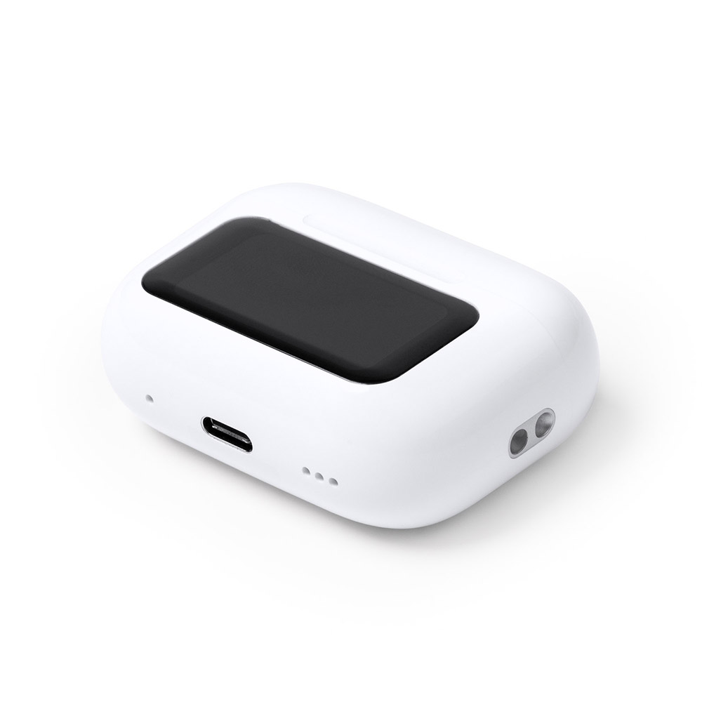 Auriculares inalámbricos con estuche equipado con pantalla táctil.