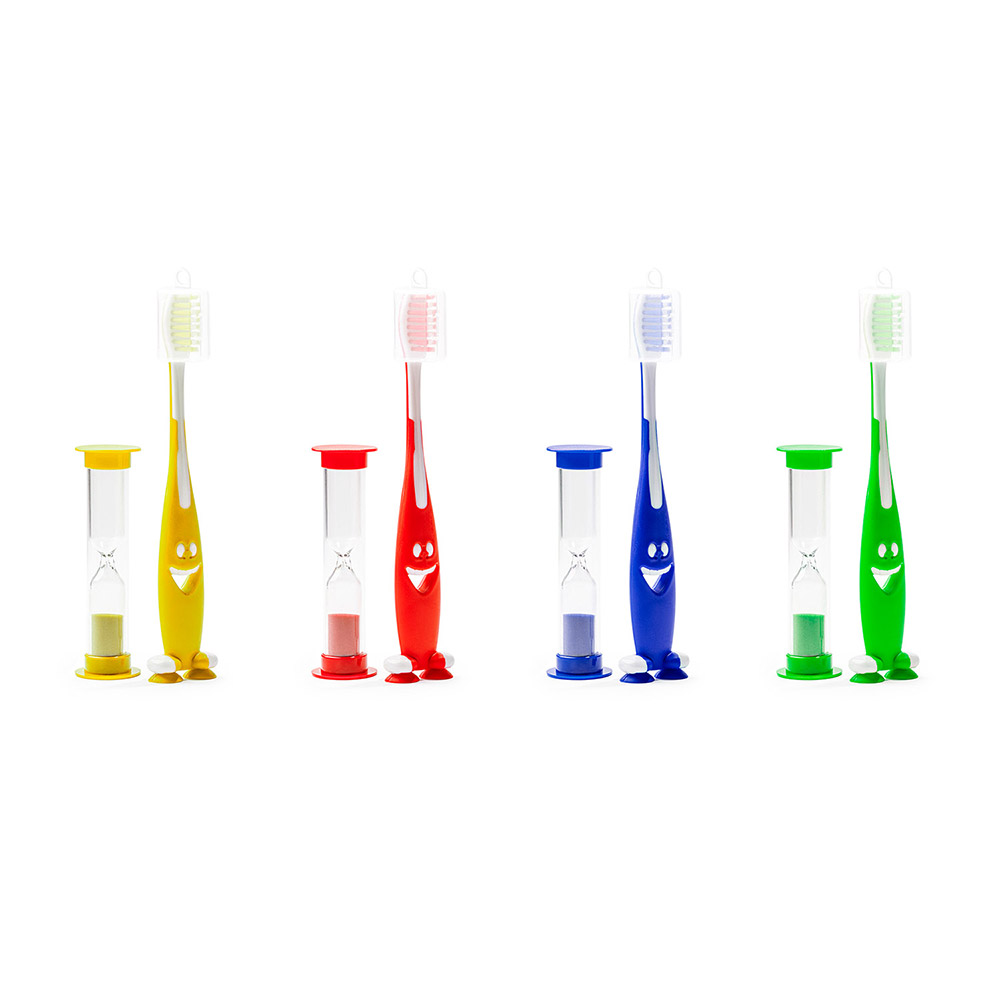 Set de cepillo de dientes y reloj de arena. Cepillo de dientes con divertido cuerpo de colores y acabado suave, con ventosas en la base. Reloj de arena de 2 minutos de duración.