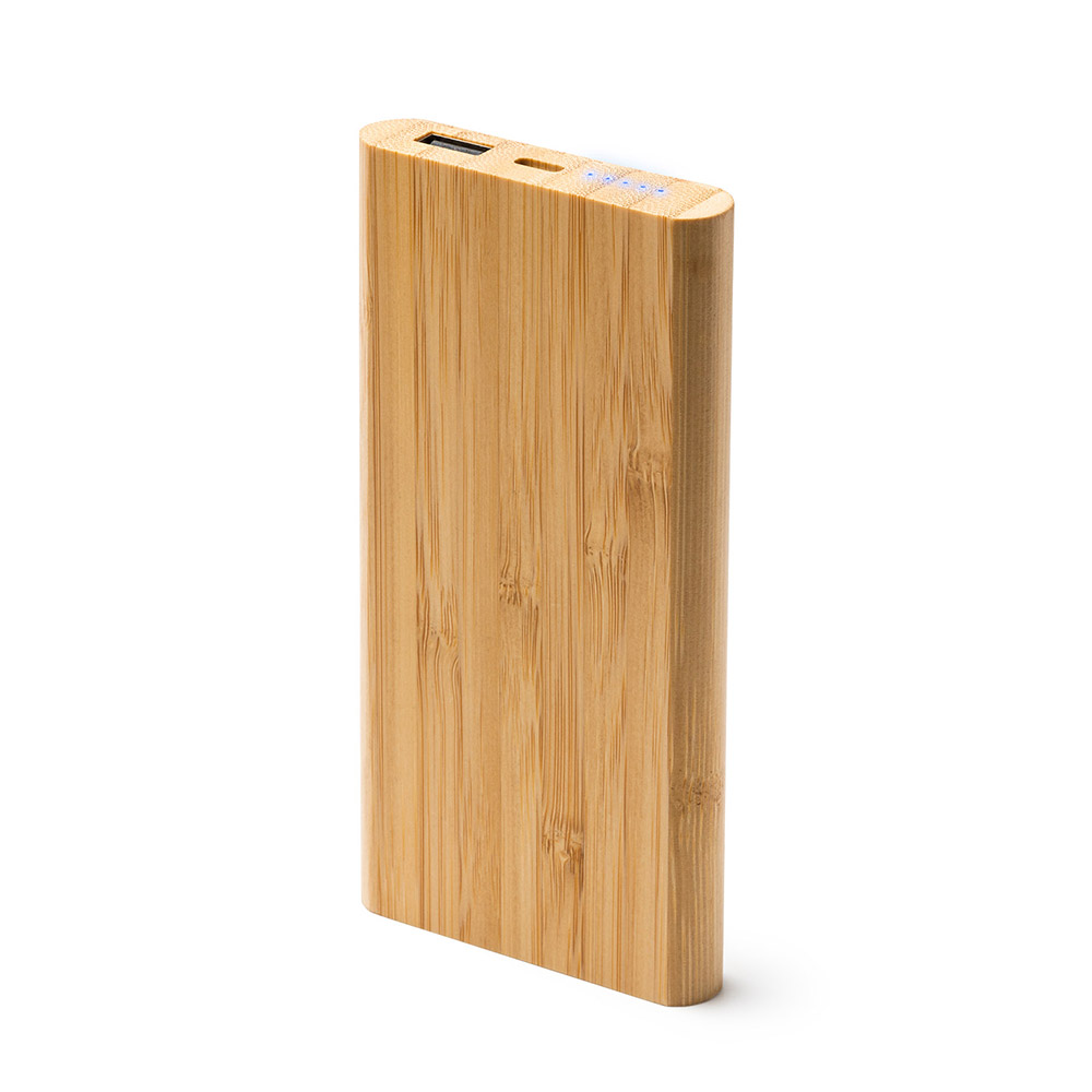 Batería externa de 6000 mAh con función carga inalámbrica, realizada con cuerpo de bambú. Salida corriente DC5V/2.1A, inalámbrica DC5V. Incluye cable tipo C.