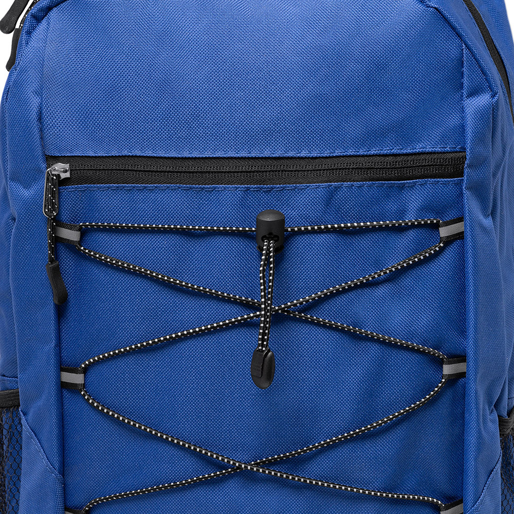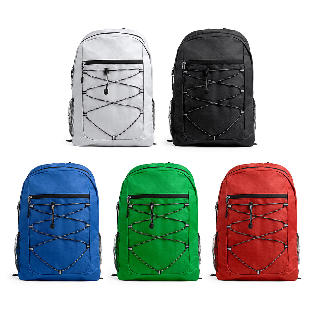 Mochila deportiva realizada en poliéster 600D. Bolsillo principal y bolsillo frontal con cierre de cremallera. Compartimento de cuerda elástica frontal con bolsillos laterales de rejilla. Espalda y tiras acolchadas.