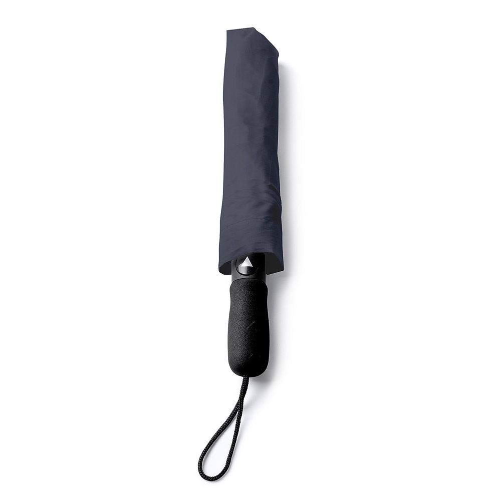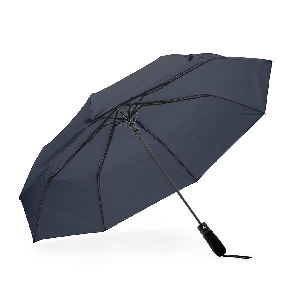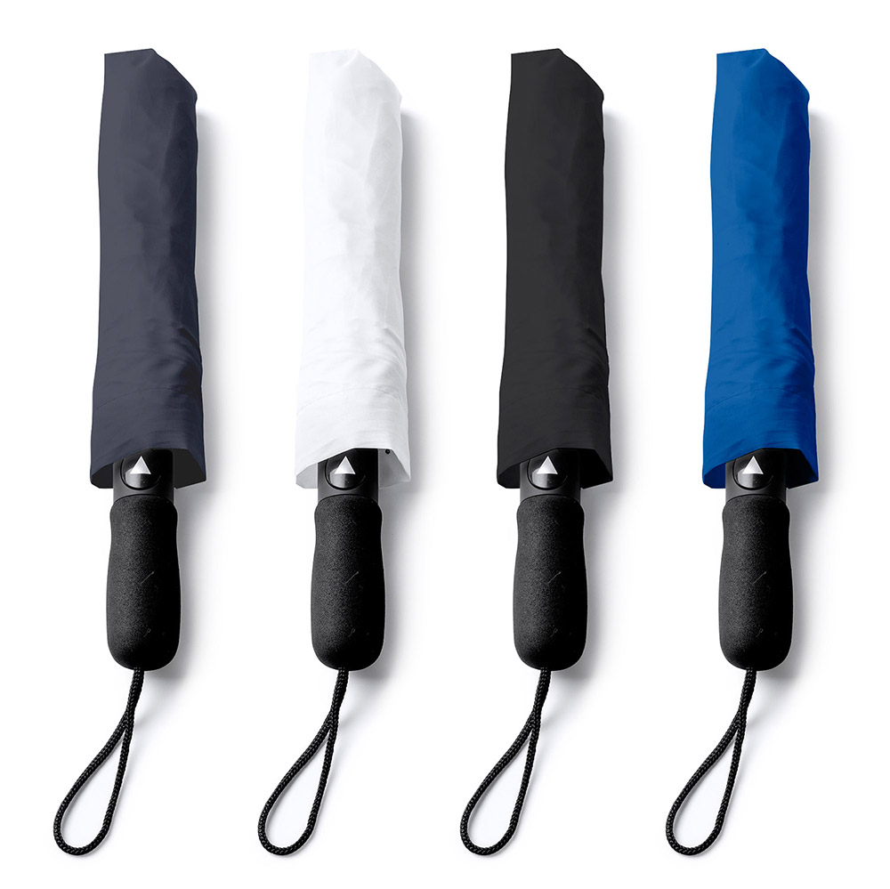 Paraguas plegable antiventiscas de apertura automática. Tejido pongee 190T con funda a juego. Mango de EVA y varillas metálicas en negro.
