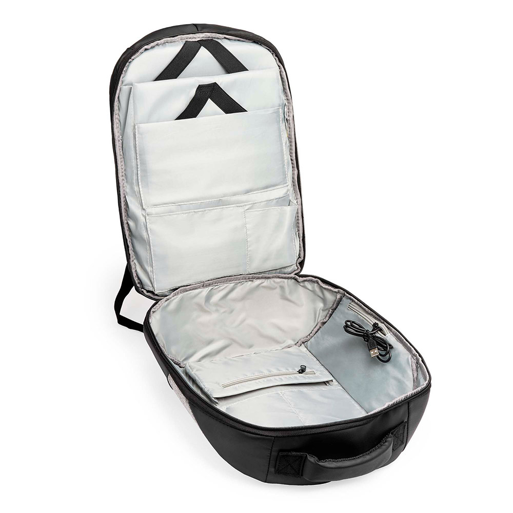 Mochila antirrobo realizada en nylon. Compartimento con salida USB para conectar un Power Bank (no incluido). Incluye cable micro USB. Bolsillo multiusos en tira derecha. Bolsillo principal con dos compartimentos acolchados ideal para portátil y Tablet.