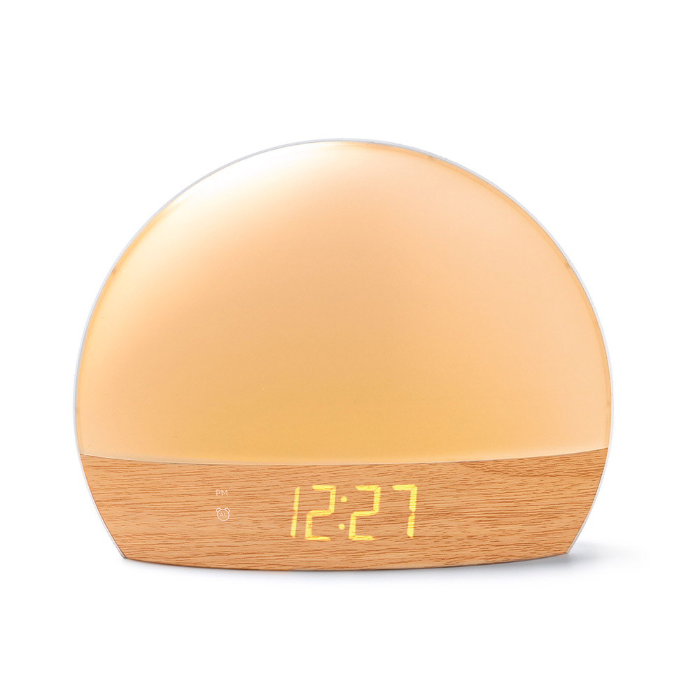 Lámpara despertador realizada en ABS reciclado con luz progresiva. Función de hora, fecha y temperatura. Cuenta con luz led en múltiples colores. Cable incluido.