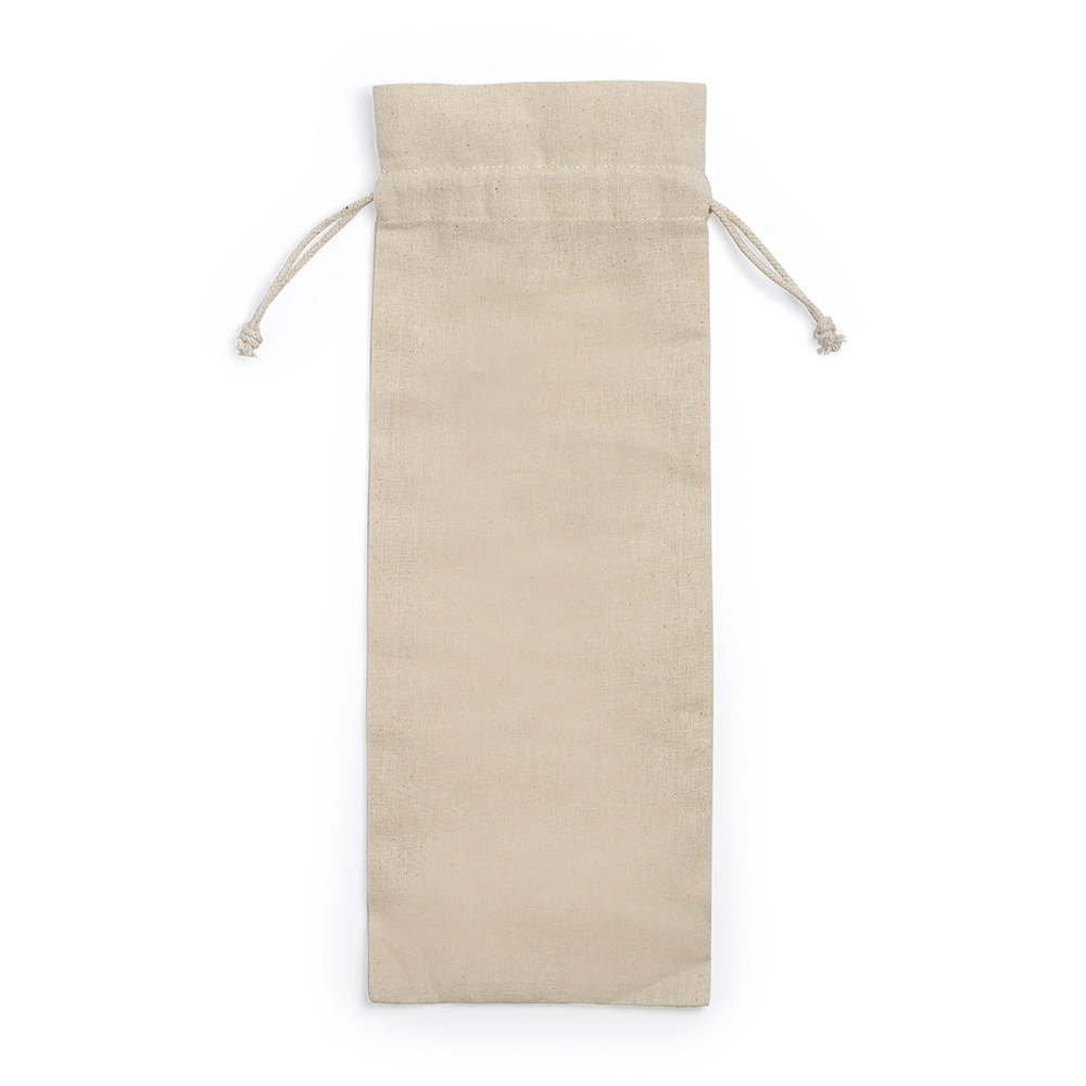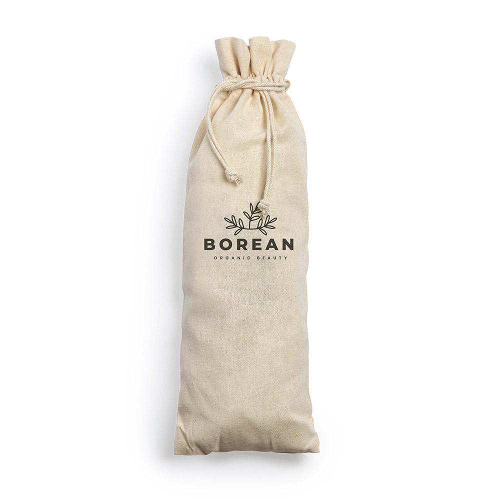 Bolsa realizada en algodón de 120 g/m². Auto-cierre de cordones. Ideal para presentar botellas y termos