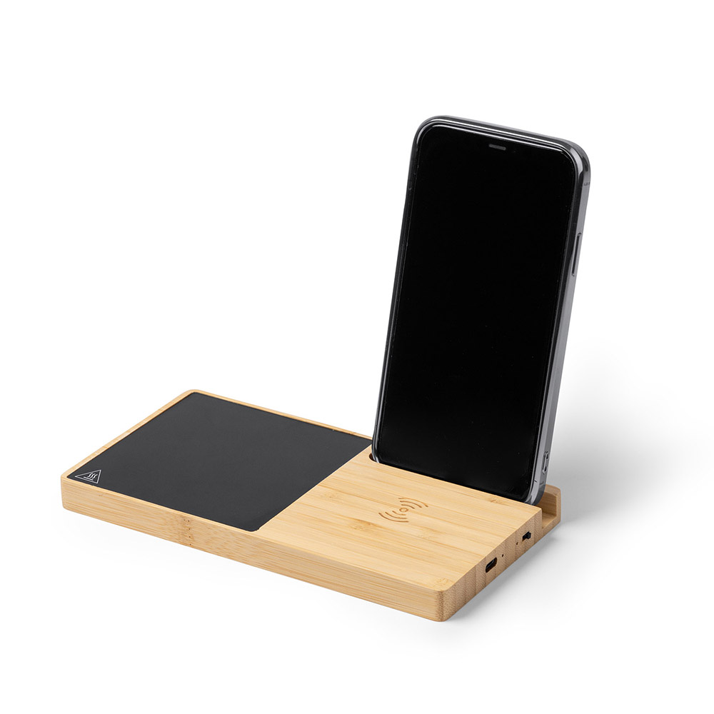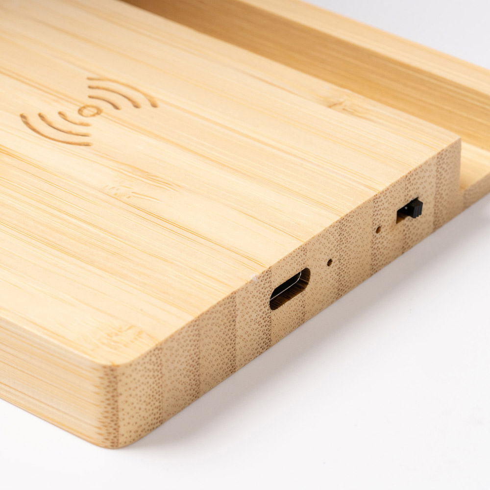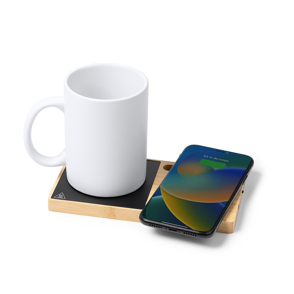 Calentador de tazas realizado en bambú con bandeja para carga rápida inalámbrica de 15W y soporte para smartphone. Cable tipo C incluido.