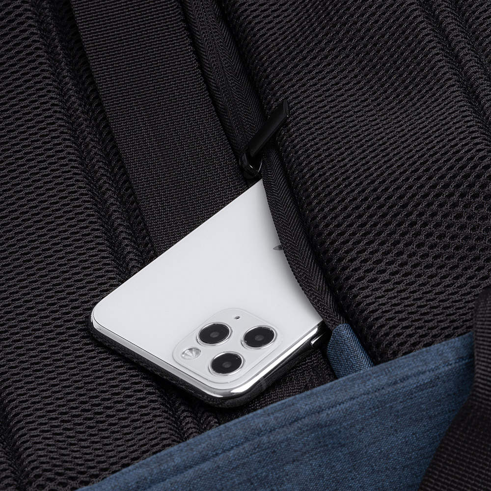 Esta mochila cuenta con dos compartimentos principales acolchados para proteger tu portátil de 15″ y tu tablet. Además, tiene un bolsillo frontal exterior acolchado, un bolsillo en el asa y un bolsillo antirrobo acolchado en la espalda.