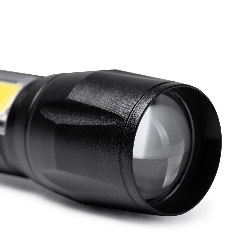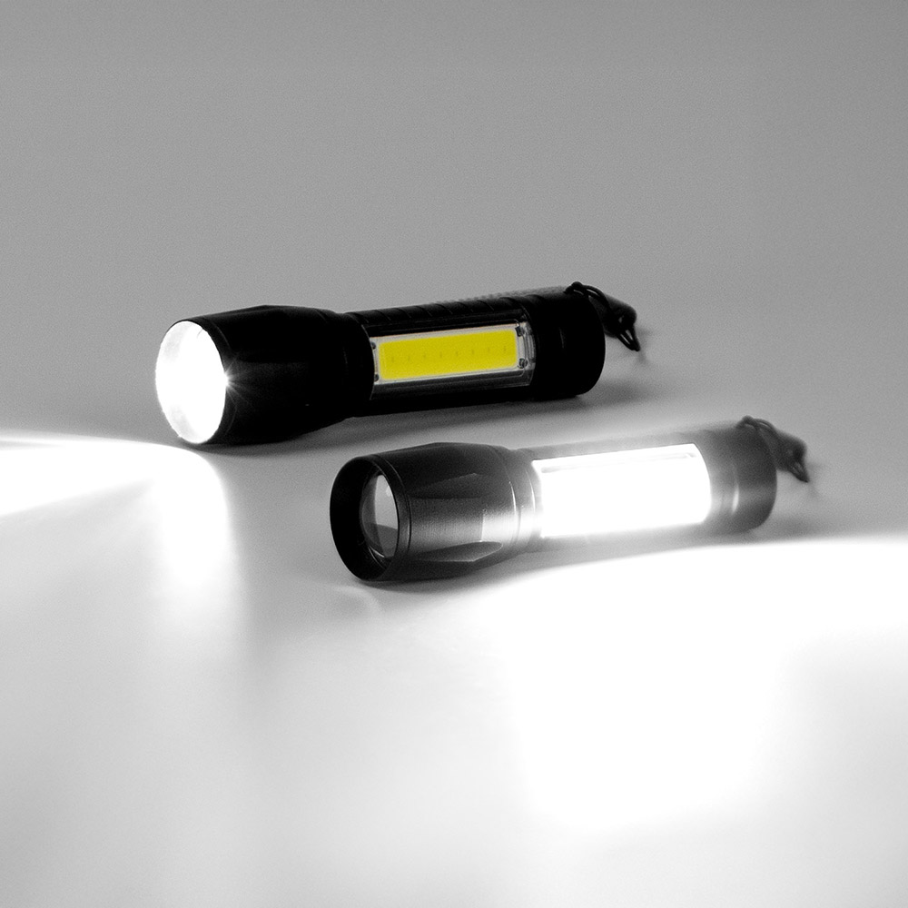 Linterna LED realizada en aluminio. 8 LEDS con 250 lumens. 3 intensidades: Fija, emergencia y lateral con 100 lumens. Batería recargable de 400 mAh. Incluye cable tipo C.