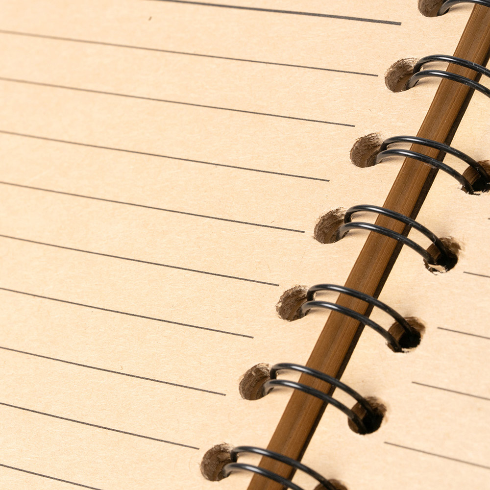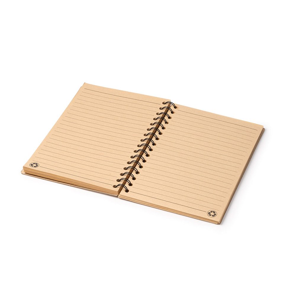 Libreta A5 con portada rígida de cartón reciclado y espiral doble. El interior cuenta con papel reciclado FSC y contiene 80 hojas a rayas. Ideal para quienes buscan una opción ecológica sin sacrificar la calidad y funcionalidad.