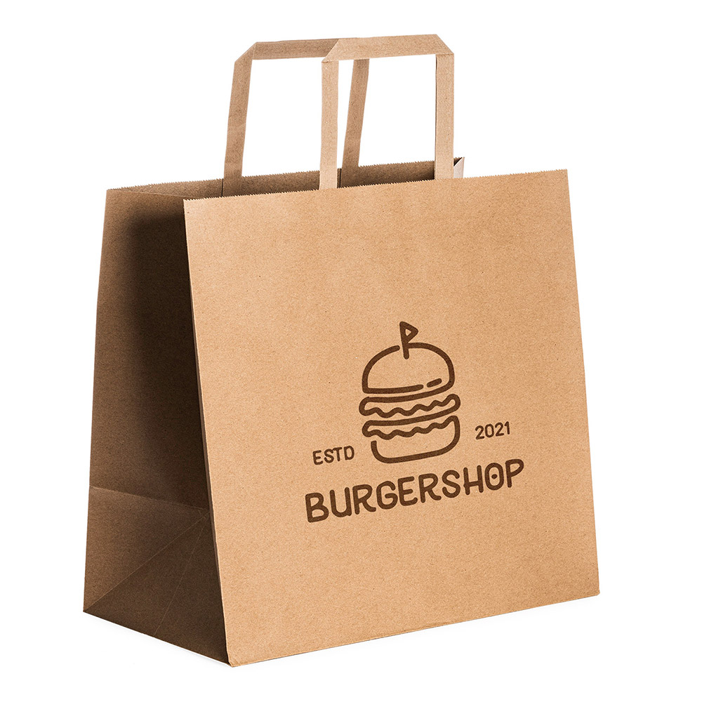 Bolsa de papel de 80 g/m² en acabado natural. Asas cortas reforzadas de diseño plano. Ideal para hostelería y restauración (take away).