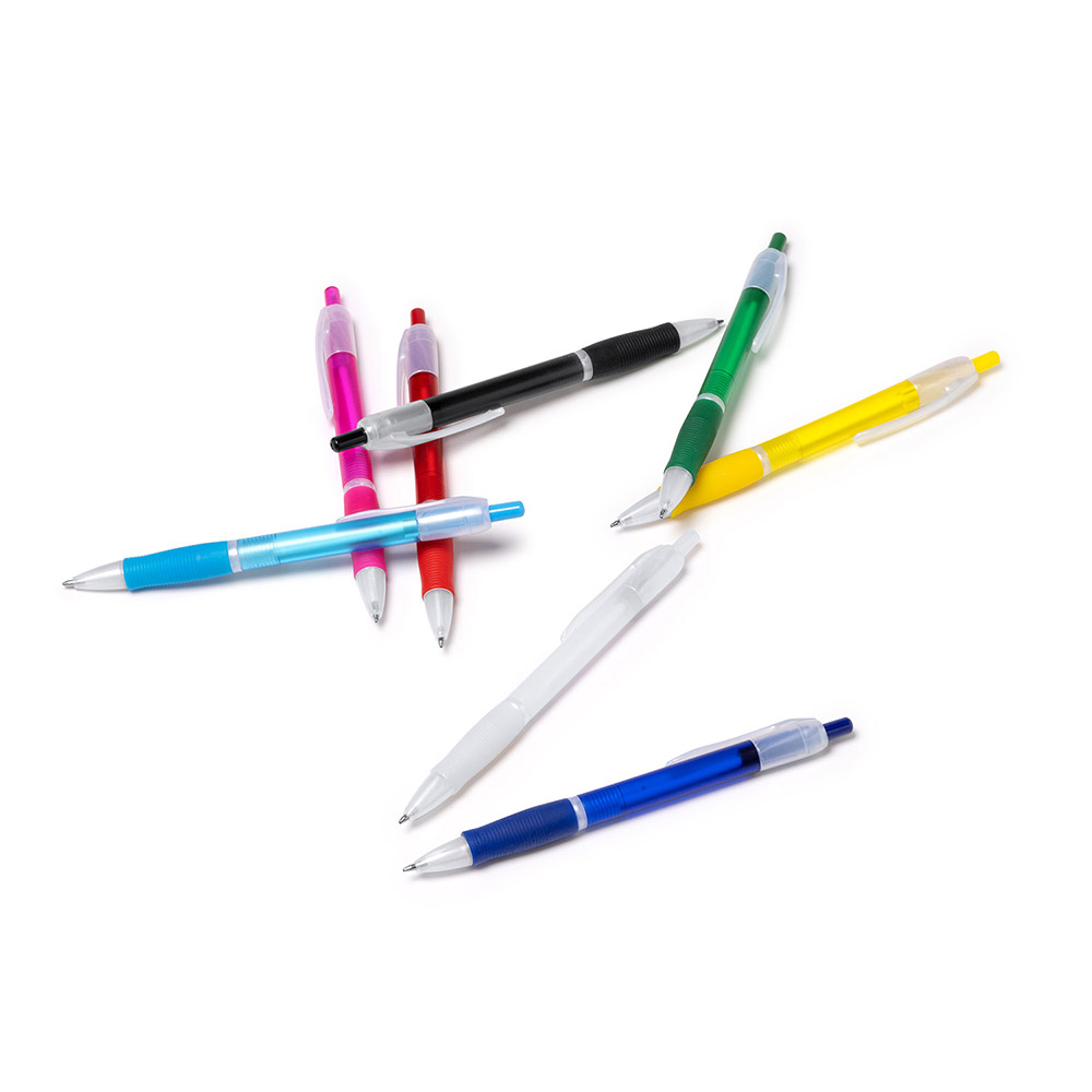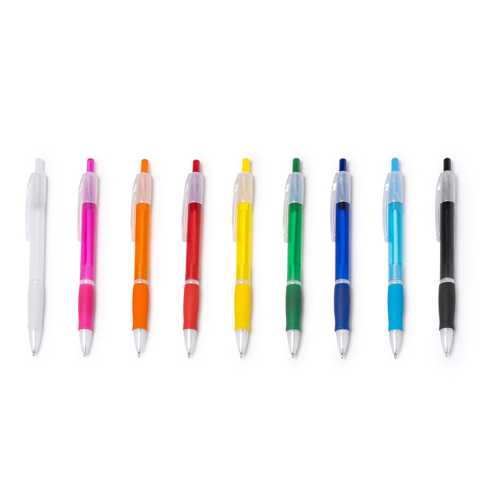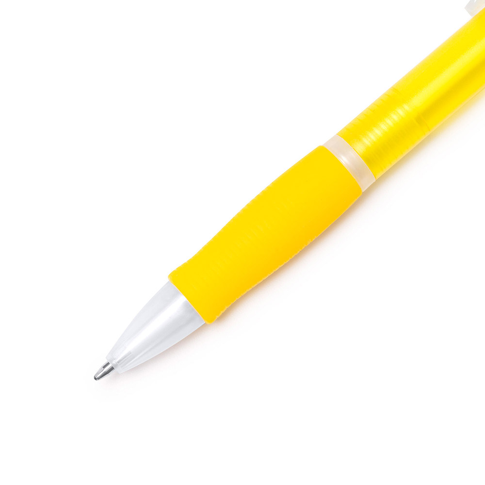 Bolígrafo con pulsador en acabado translúcido y cómoda empuñadura a juego. Tinta azul.