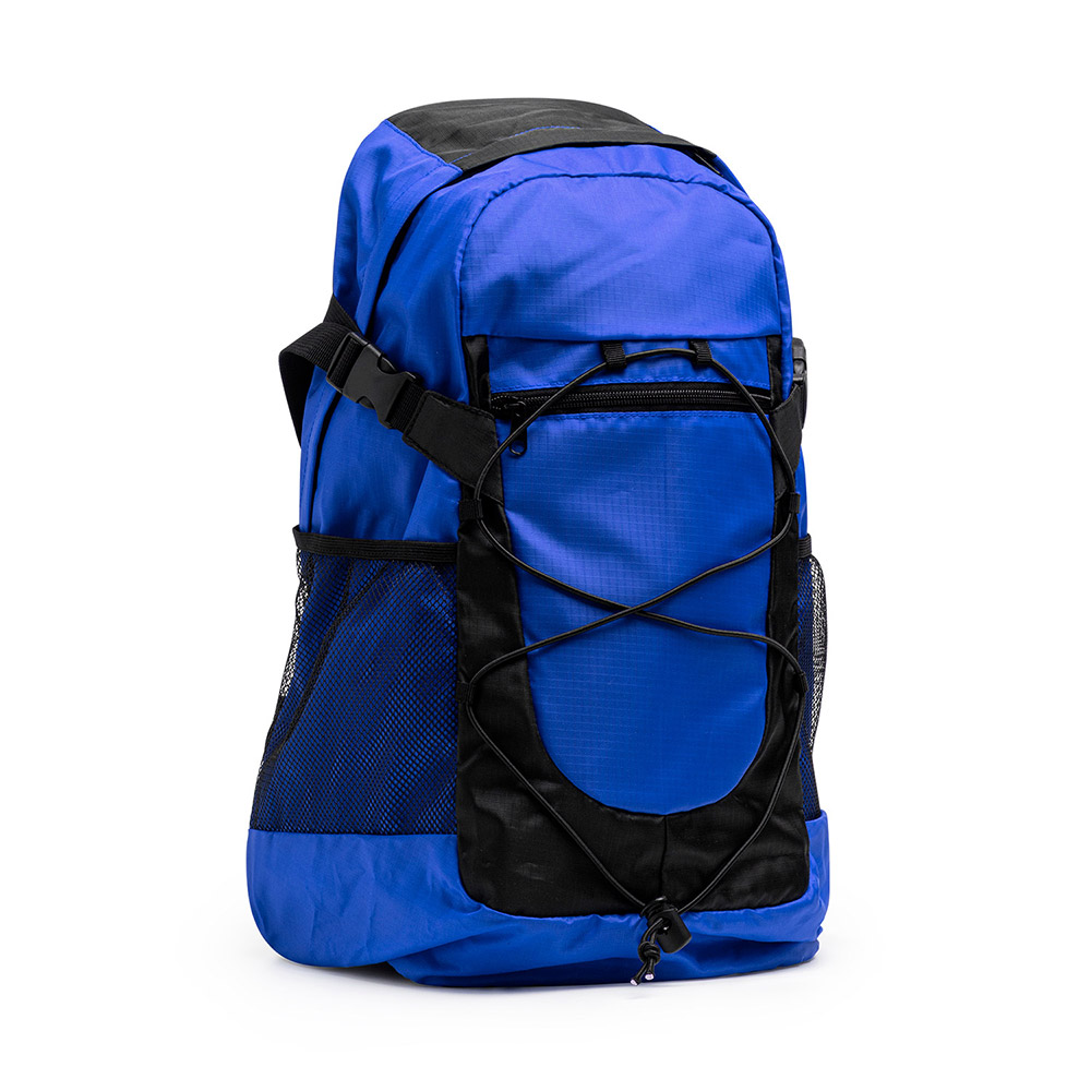 Mochila deportiva realizada en Nylon 210D Ripstop de alta resistencia. Capacidad 30L. Doble compartimento principal con cierre de cremallera y bolsillos interiores. Compartimento de cuerda elástica frontal y bolsillos laterales de rejilla. Espalda y tiras acolchadas. Incluye cinta ajustable lateral.