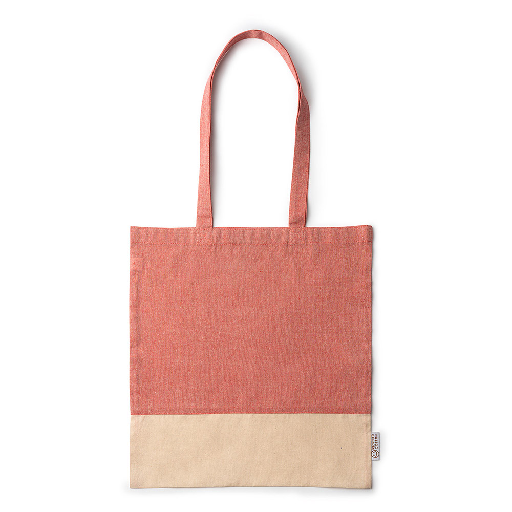 Bolsa de algodón reciclado con acabado jaspeado y algodón natural de 120 g/m². Asas largas reforzadas de 70 cm.