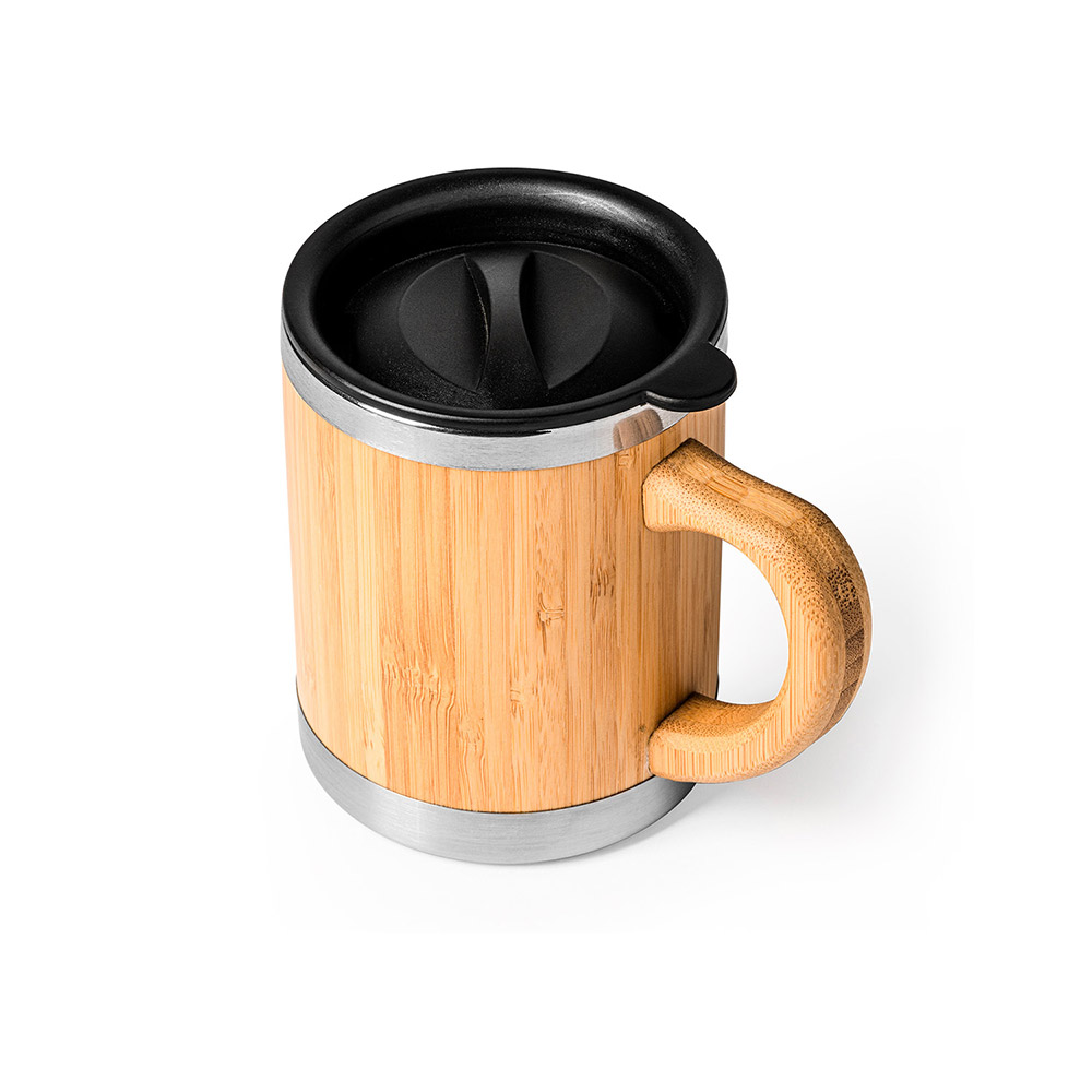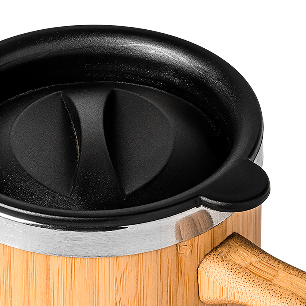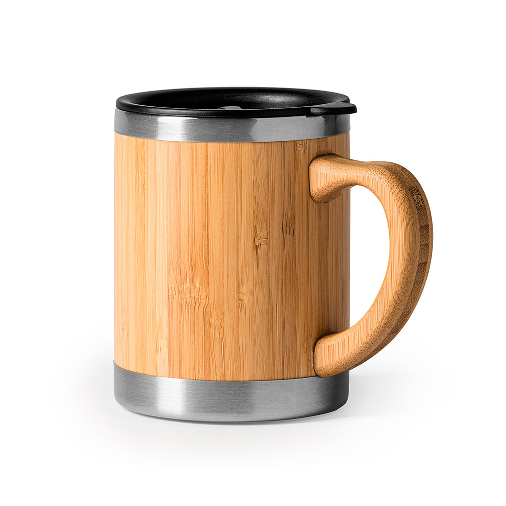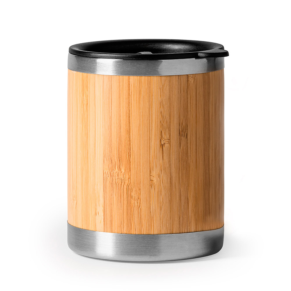 Taza de acero inoxidable con doble pared y exterior en bambú. Incluye tapa dosificadora. 340 ml de capacidad. Esta fantástica taza, es la más completa, podrás usarla tanto en casa, como fuera, todo esto combinado con un elegante diseño.