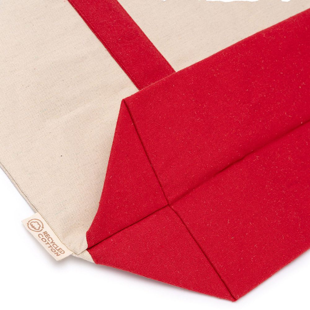 Bolsa de playa realizada en algodón reciclado 280 g/m². Asas a color reforzadas fabricadas en algodón a juego con la bolsa. Medida asas: 65 cm