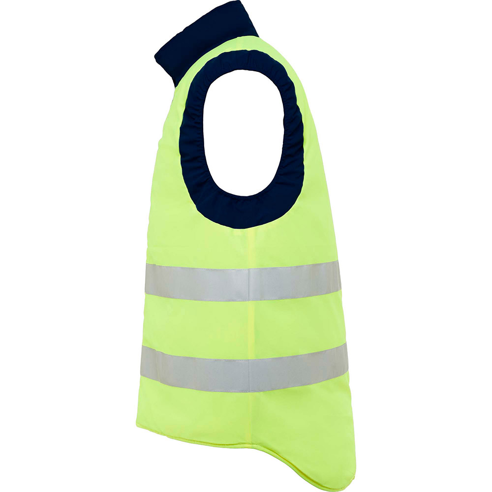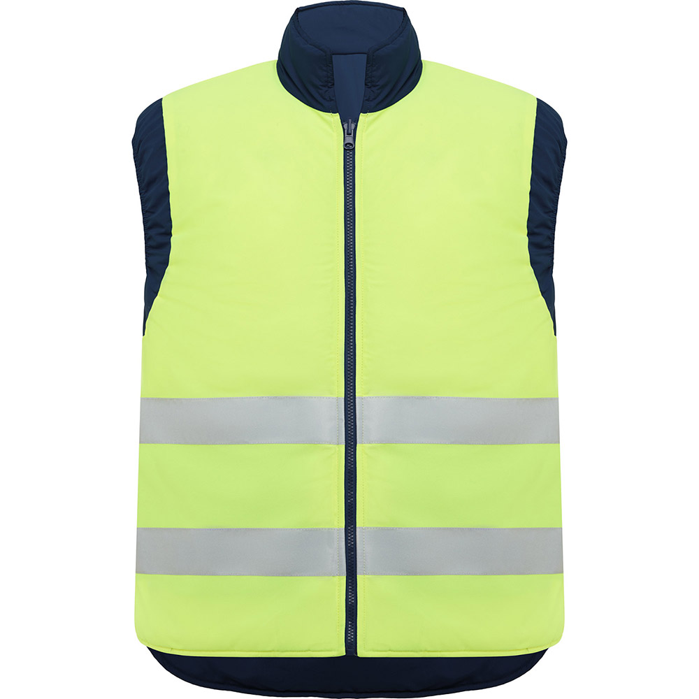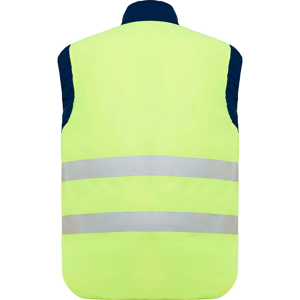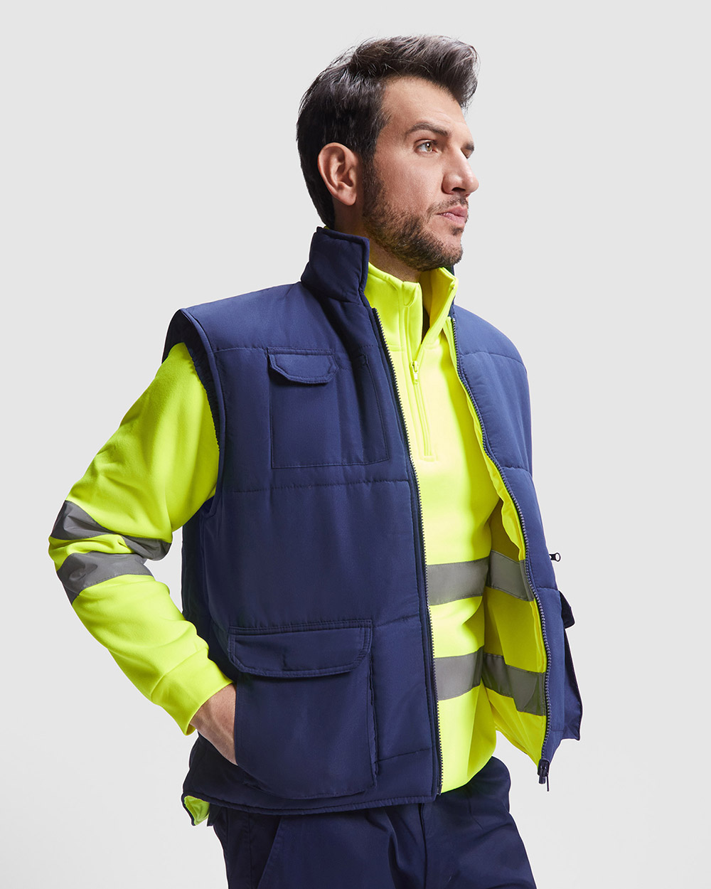 Chaleco reversible multibolsillos y alta visibilidad, con cuello alto.