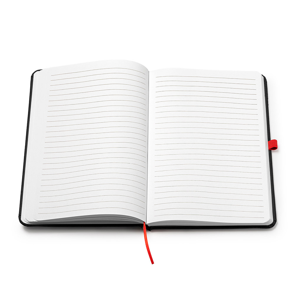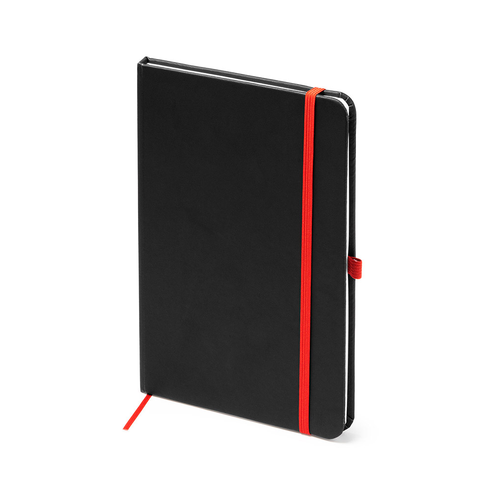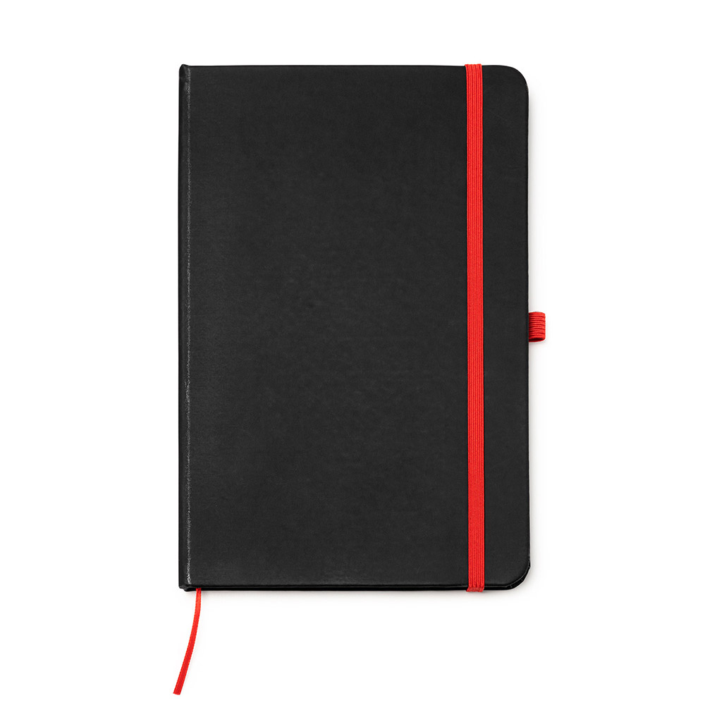 Bloc de notas A5 con tapa rígida de PU negro. Marcapáginas, banda elástica de cierre y soporte para bolígrafo a color. Cuenta con 80 hojas rayadas.