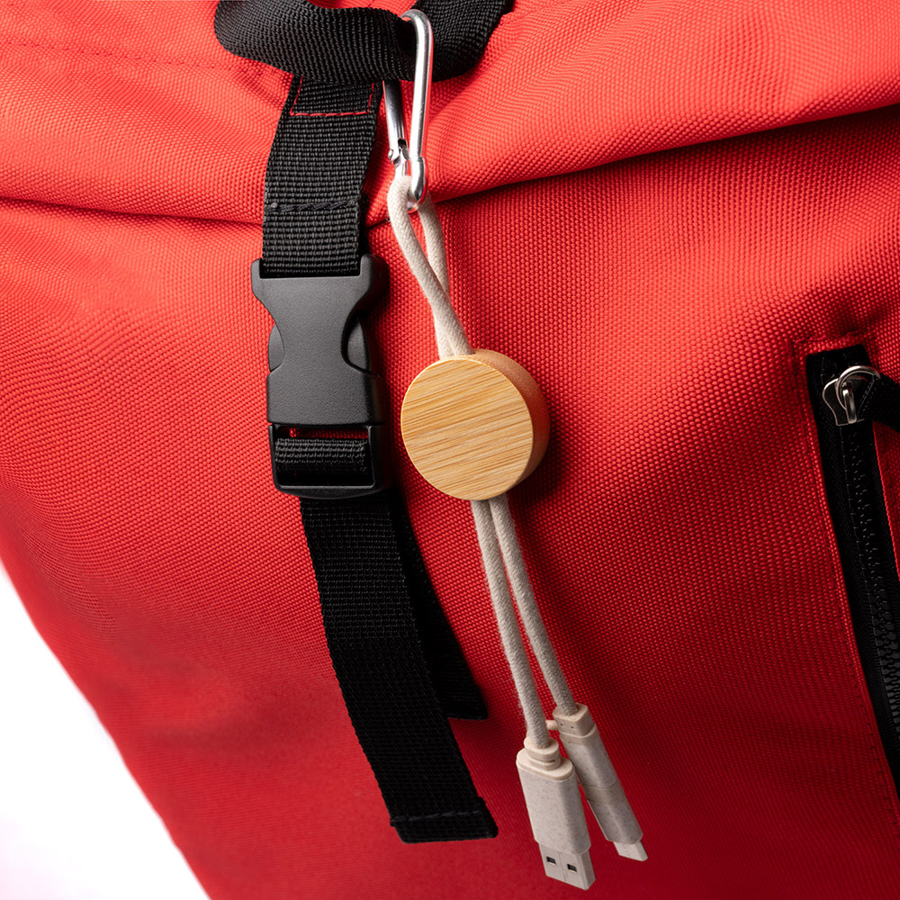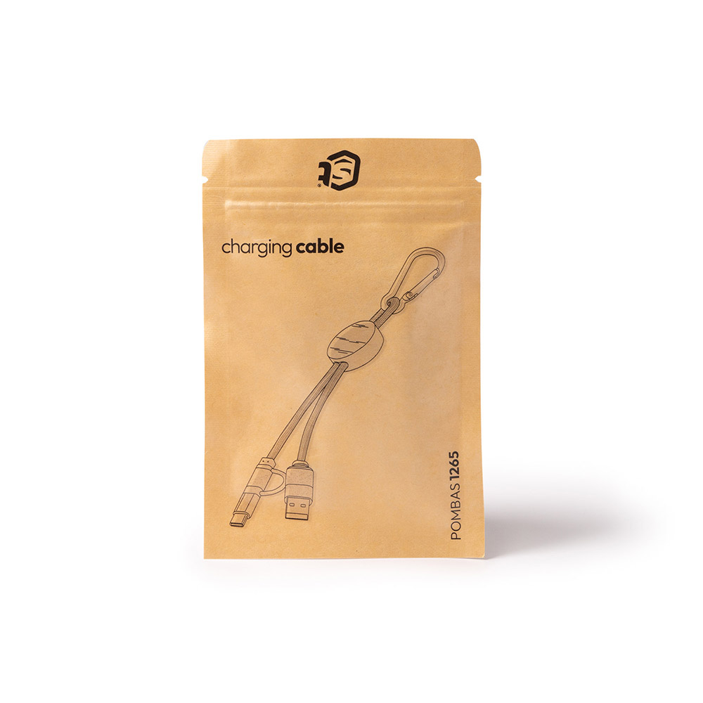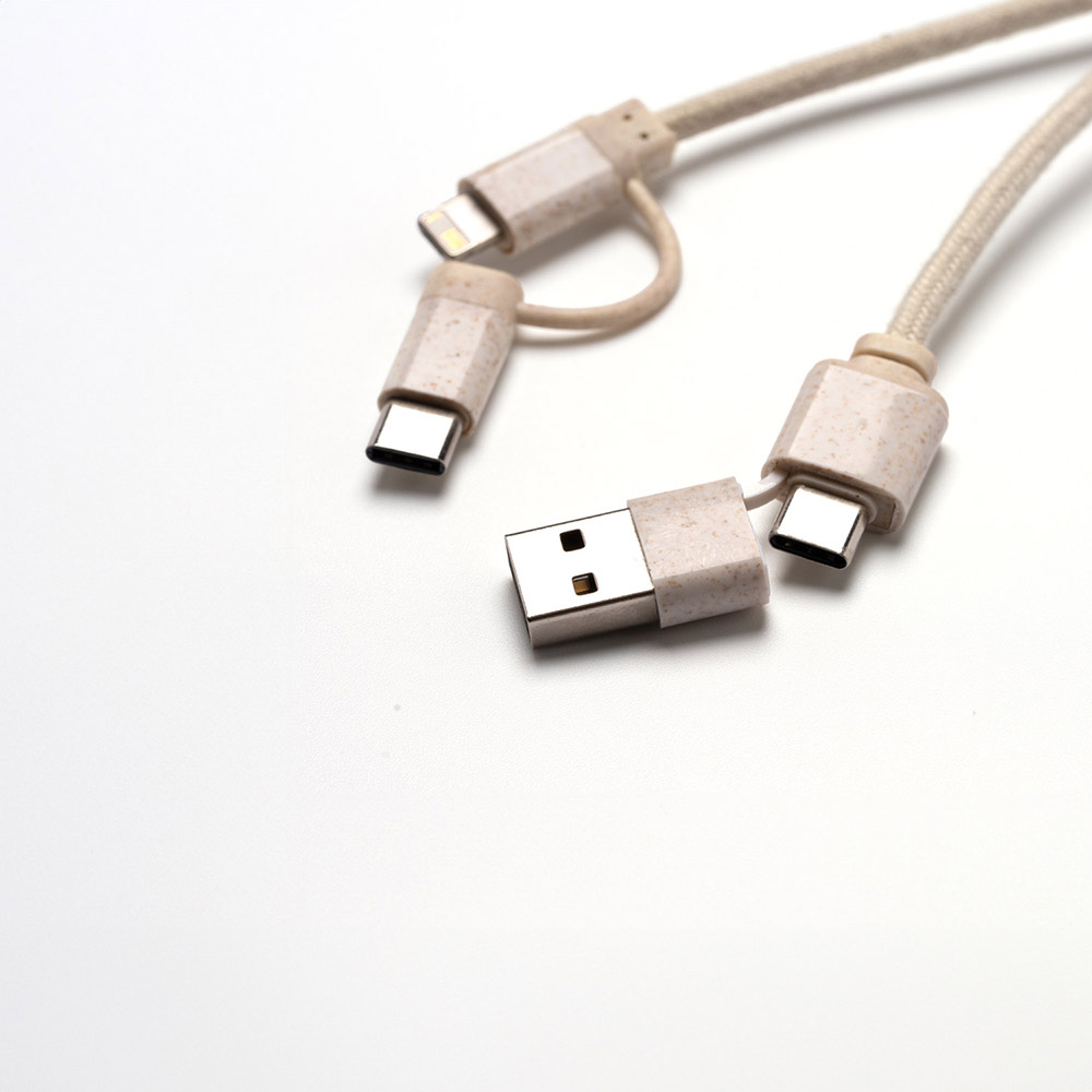 Cable 4 en 1. Cuerpo de bambú, cable de algodón y detalles en fibra de trigo. Entrada USB y Tipo C. Salida de USB, Tipo C y Lightning. Incluye mosquetón.