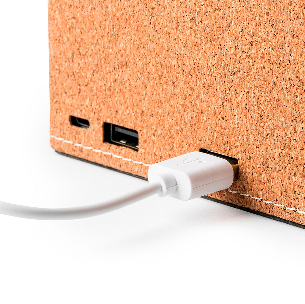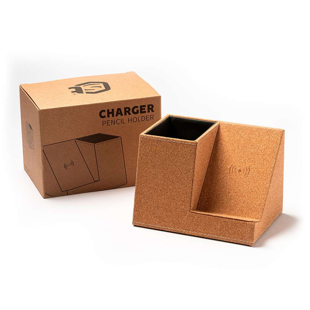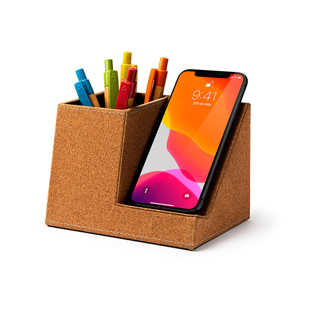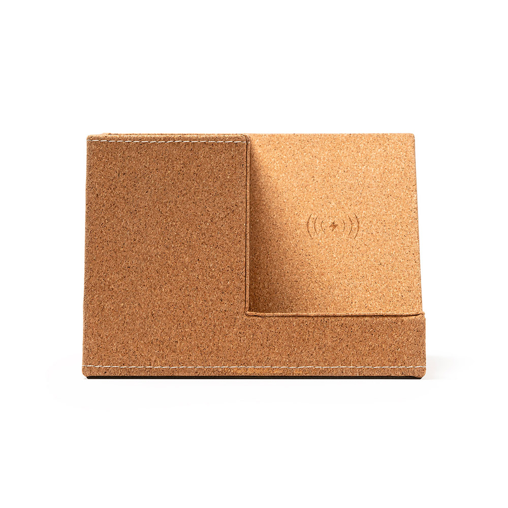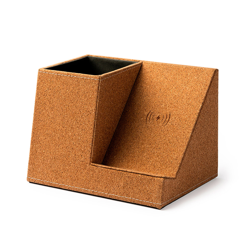 Portalápices con superficie de carga inalámbrica integrada con potencia de 5W. Realizado en corcho natural.