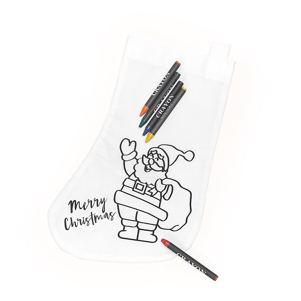 Calcetín con divertido diseño navideño para colorear. Incluye 5 ceras de colores: azul, rojo, negro, amarillo y verde.