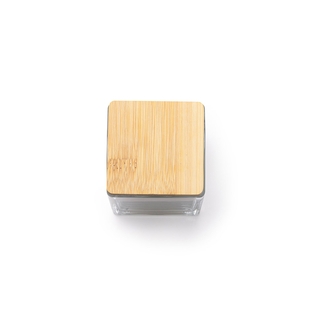 El recipiente de cristal le da un toque sofisticado a la vela, permitiendo que la luz de la llama se refleje de manera suave y sutil. La tapa de bambú no solo añade un elemento natural y decorativo, sino que también ayuda a mantener la fragancia de la vela cuando no está en uso.