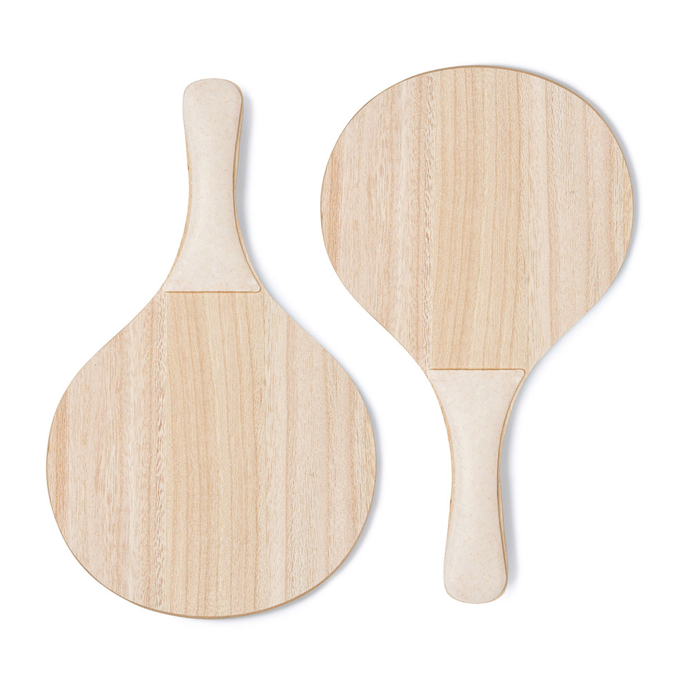 Juego de palas de playa realizadas en madera y fibra de trigo. Incluye multijuego: ajedrez y parchís. Las palas vienen presentadas en funda de algodón.