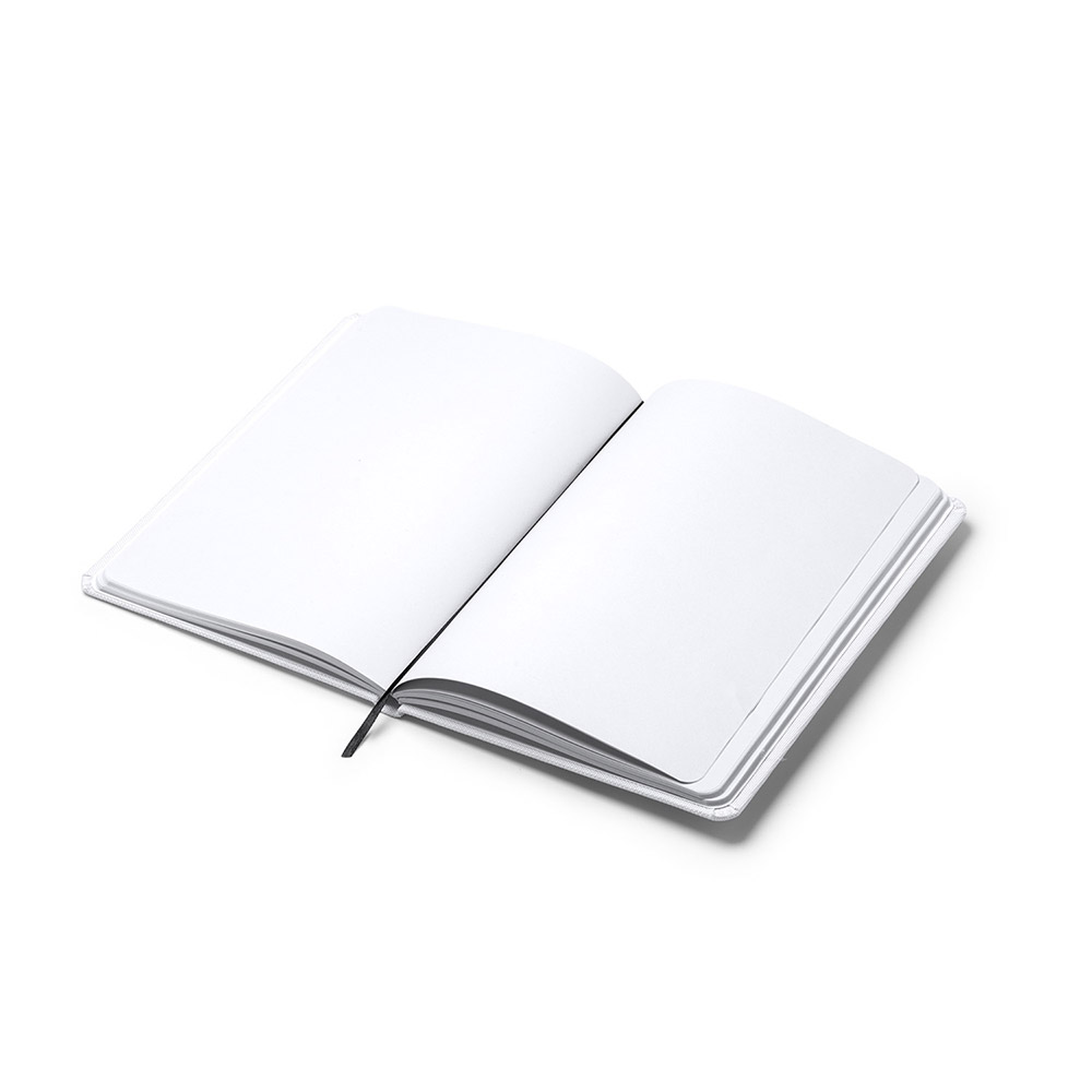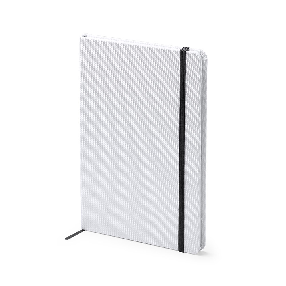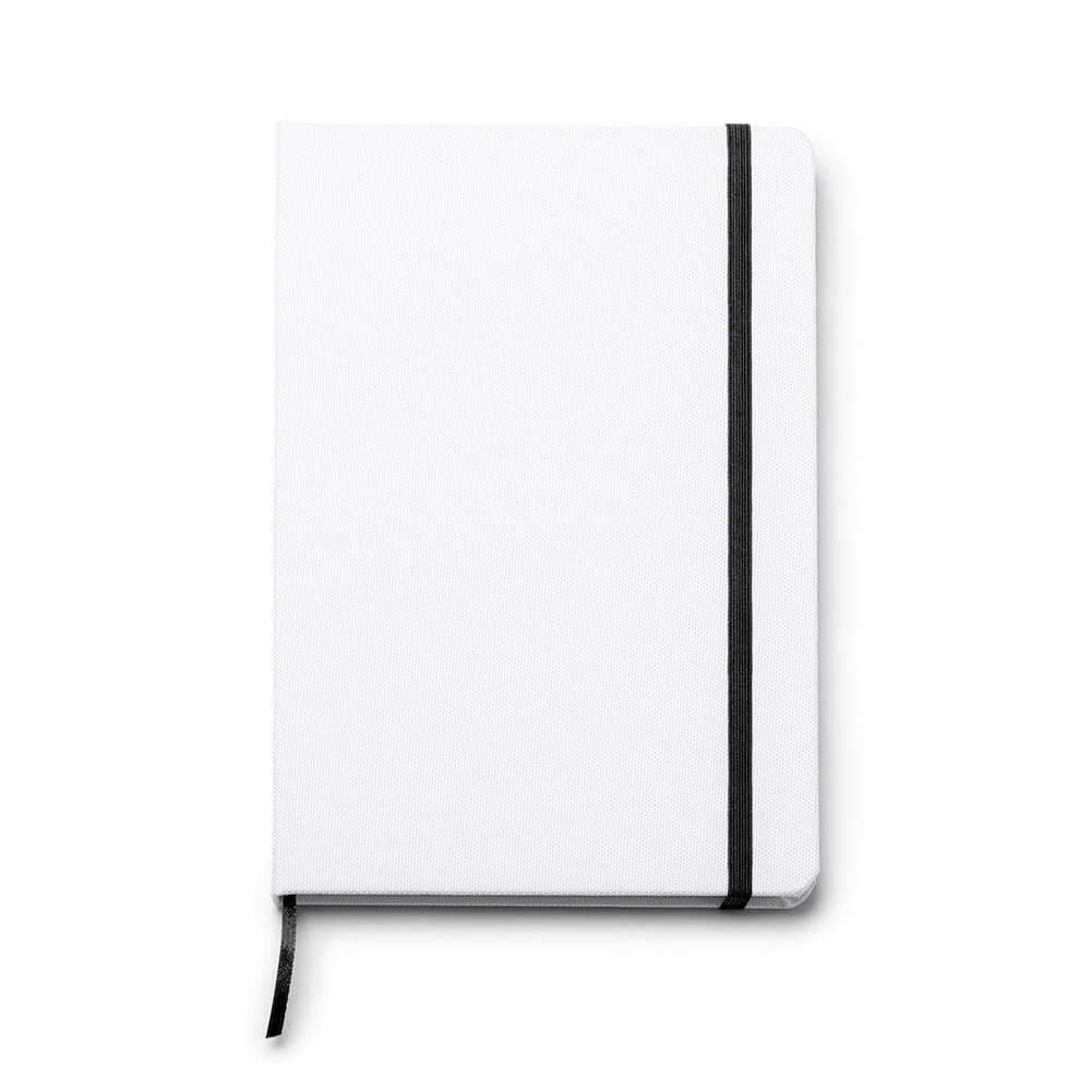 Bloc de notas tamaño A5 ideal para sublimación de tapa rígida. Incluye marcador de páginas y banda elástica de cierre a juego. Contiene con 100 hojas a lisas.