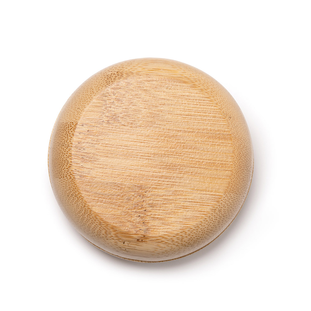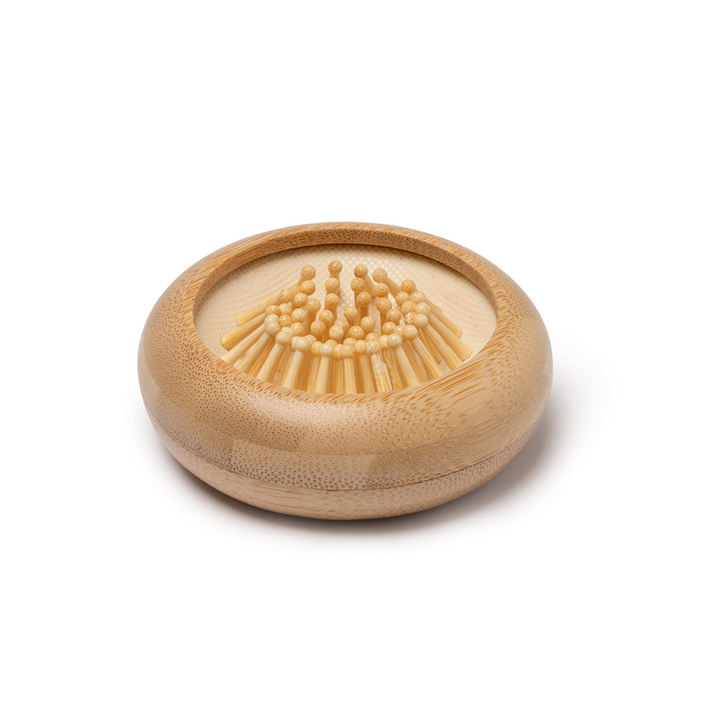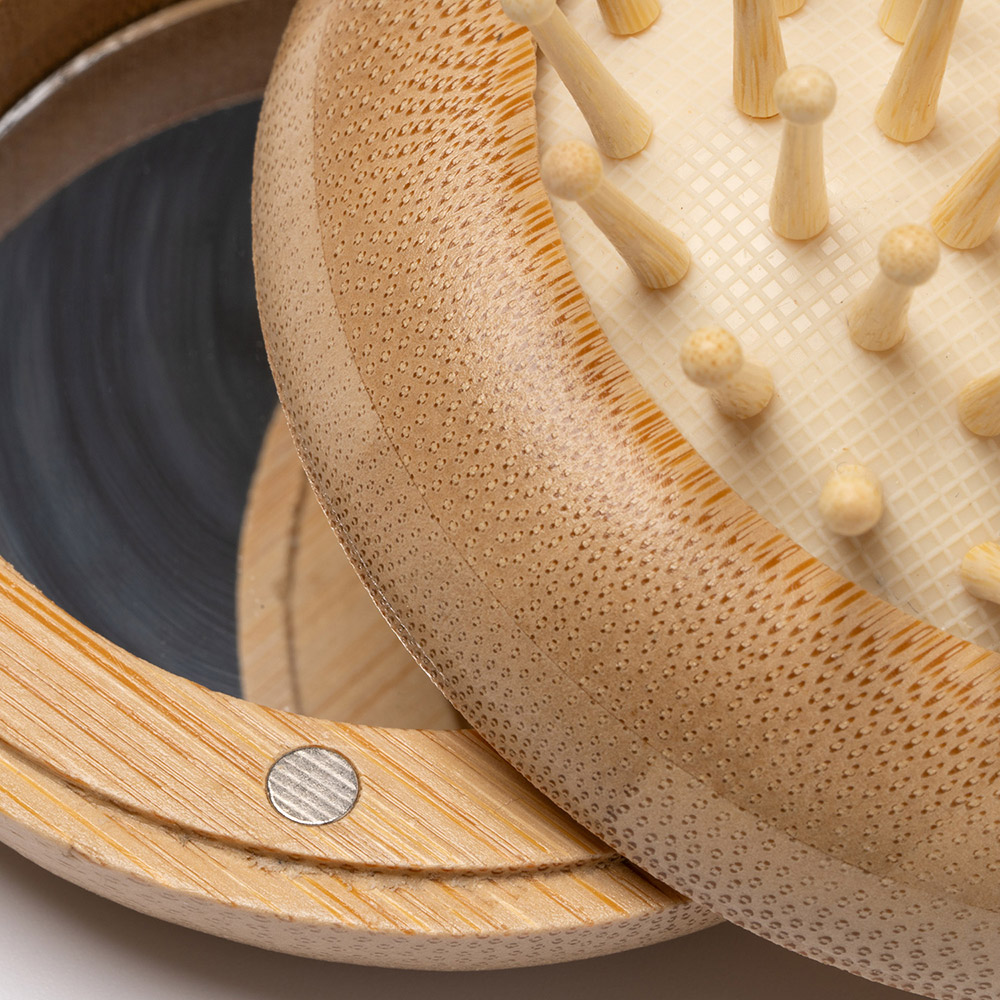 Cepillo plegable con cuerpo y cerdas de bambú, que incorpora un espejo en la parte trasera. Perfecto para cuidar el cabello de manera práctica y sostenible en cualquier lugar.