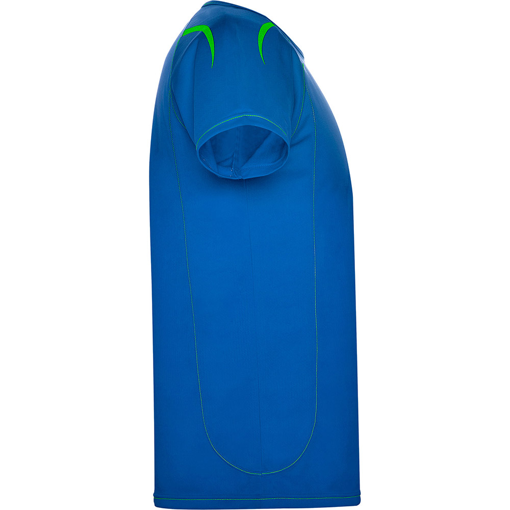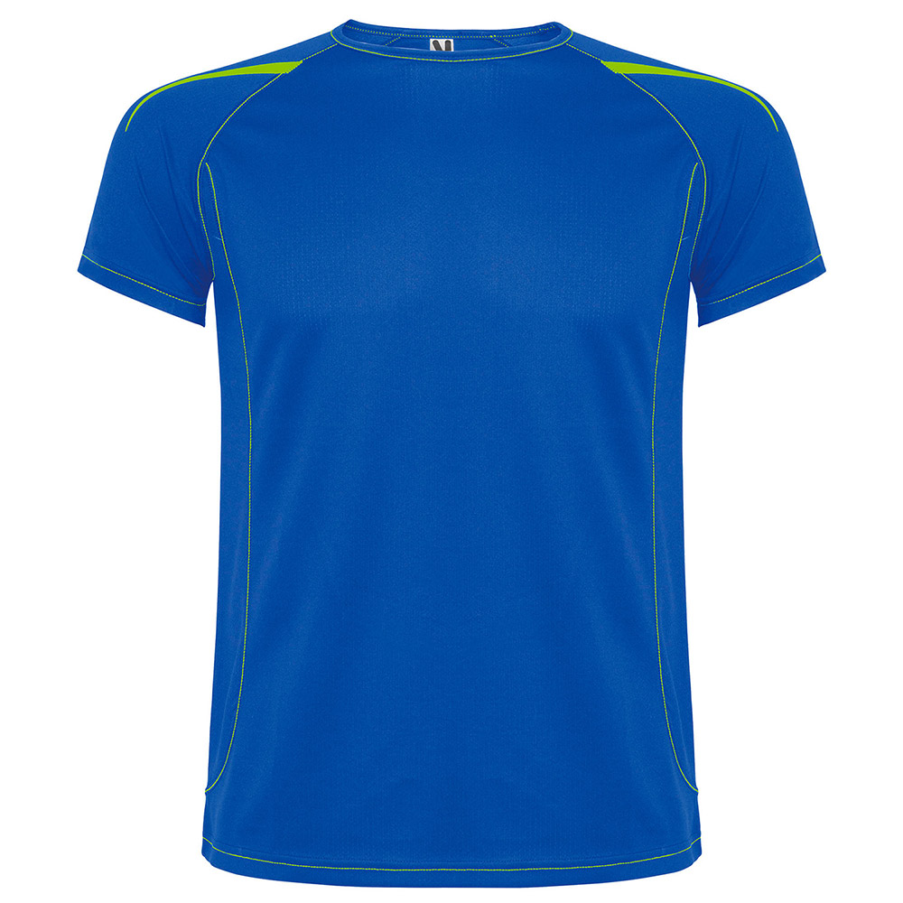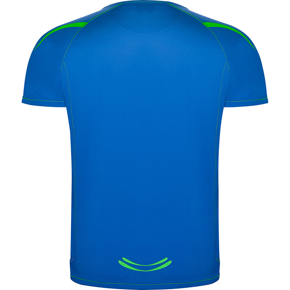 Camiseta técnica en tejido punto liso, de manga corta ranglán, con costuras en contraste en bocamangas, bajo, cuello y laterales. Cuello viveado con el mismo tejido. Tejido transpirable de fácil lavado y secado. Detalles reflectantes, excepto en colores negro y royal, que el detalle es en contraste en color amarillo, no reflectante.