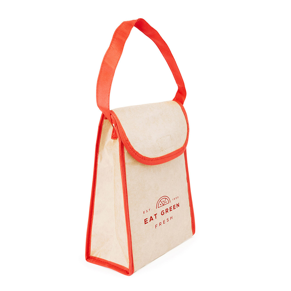 Bolsa nevera de papel laminado, con interior isotérmico de aluminio y espuma aislante de 2 mm. Asa de 60 cm. y solapa con cierre de velcro. Ribete de la bolsa y asa en color a juego.