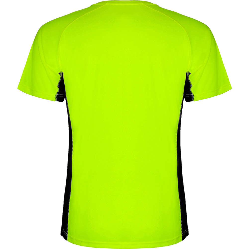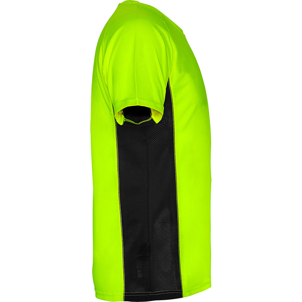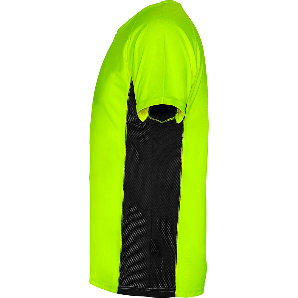 Camiseta técnica combinada con dos tejidos de poliéster, manga corta de estilo ranglán. Tejido principal bird’s eye y paneles laterales e interior de la manga con tejido micro perforado. Cuello redondo con cubrecosturas de refuerzo en su interior. Camiseta de tejido confortable y fácilmente adaptable al cuerpo.