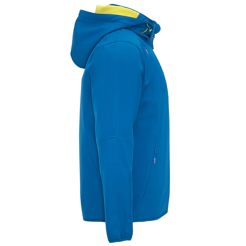 Softshell compuesto de 2 capas con corte deportivo. Cremallera central a contraste con protector de barbilla y tirador. Forro interior en tejido micropolar a contraste. Cuenta con bolsillo exterior en pecho derecho con cremallera invisible con forma diagonal, dos bolsillos exteriores laterales con cremallera invisible, y un bolsillo en manga izquierda. Ribete elástico a tono en puños y bajo. Capucha extraible con forro micropolar a constraste.