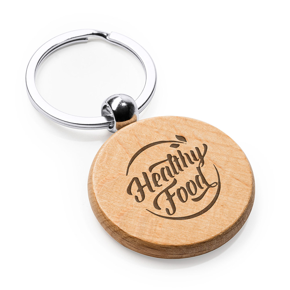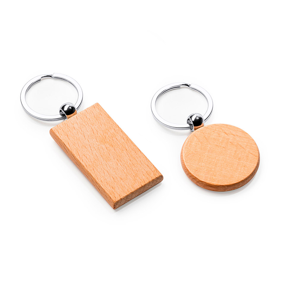 Llavero de madera natural en dos formatos con anilla metálica.