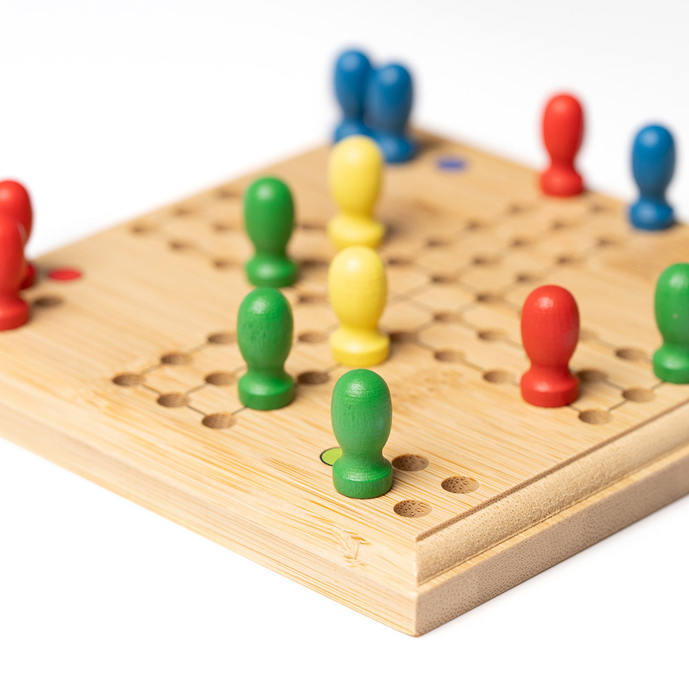 Juego de parchís realizado en bambú. Incluye tablero, un dado y 16 fichas de 4 colores. Incluye funda de algodón.