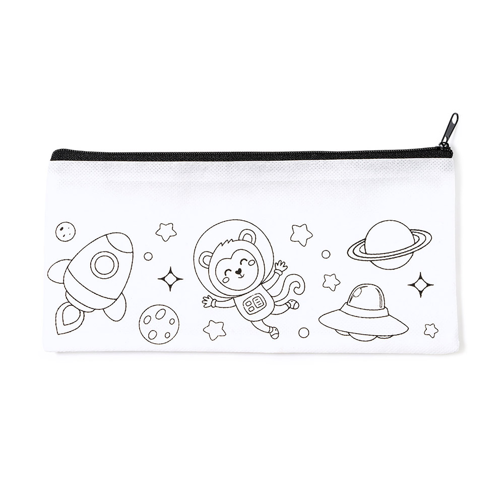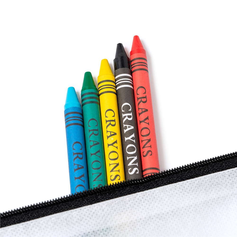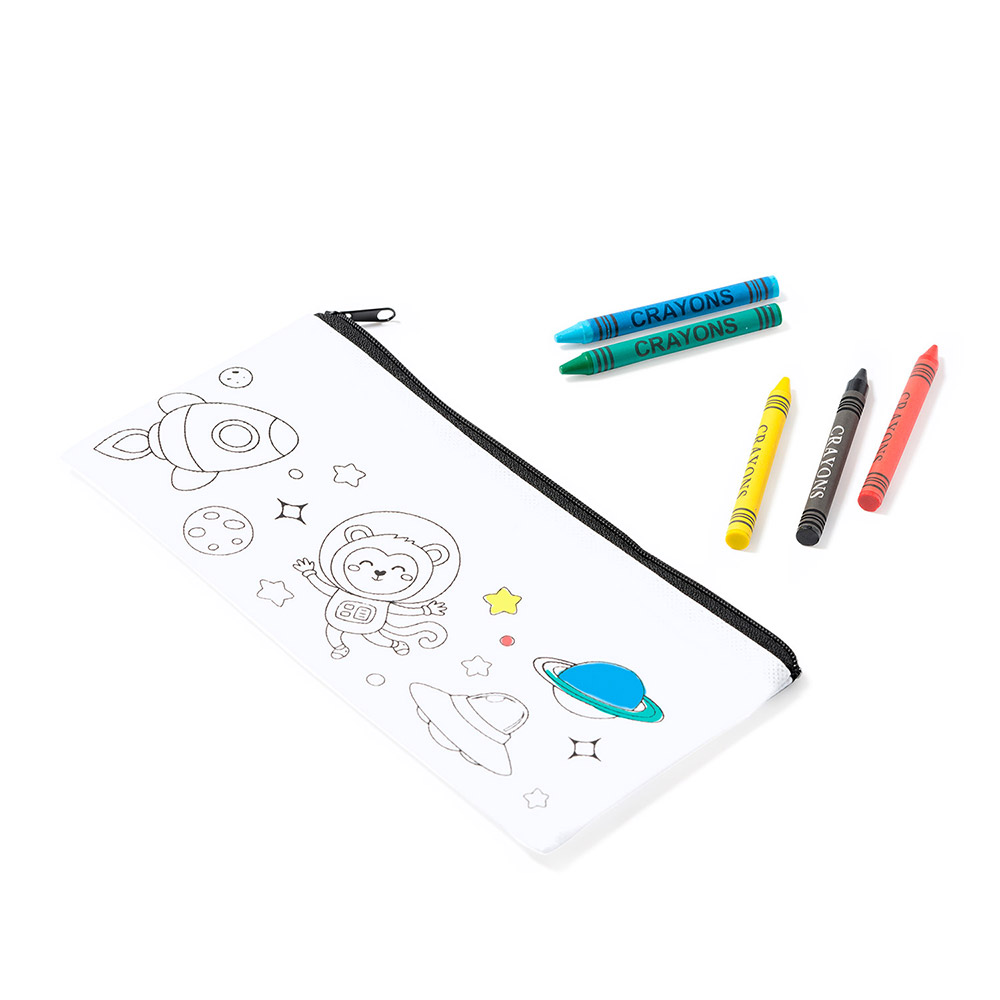 Estuche infantil de non-woven con diseño para colorear. Incluye 5 ceras de colores variados. Estuche con cierre de cremallera en color negro.