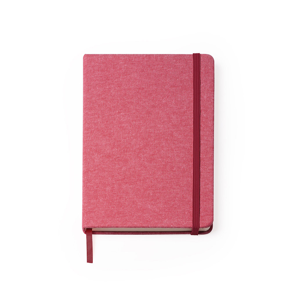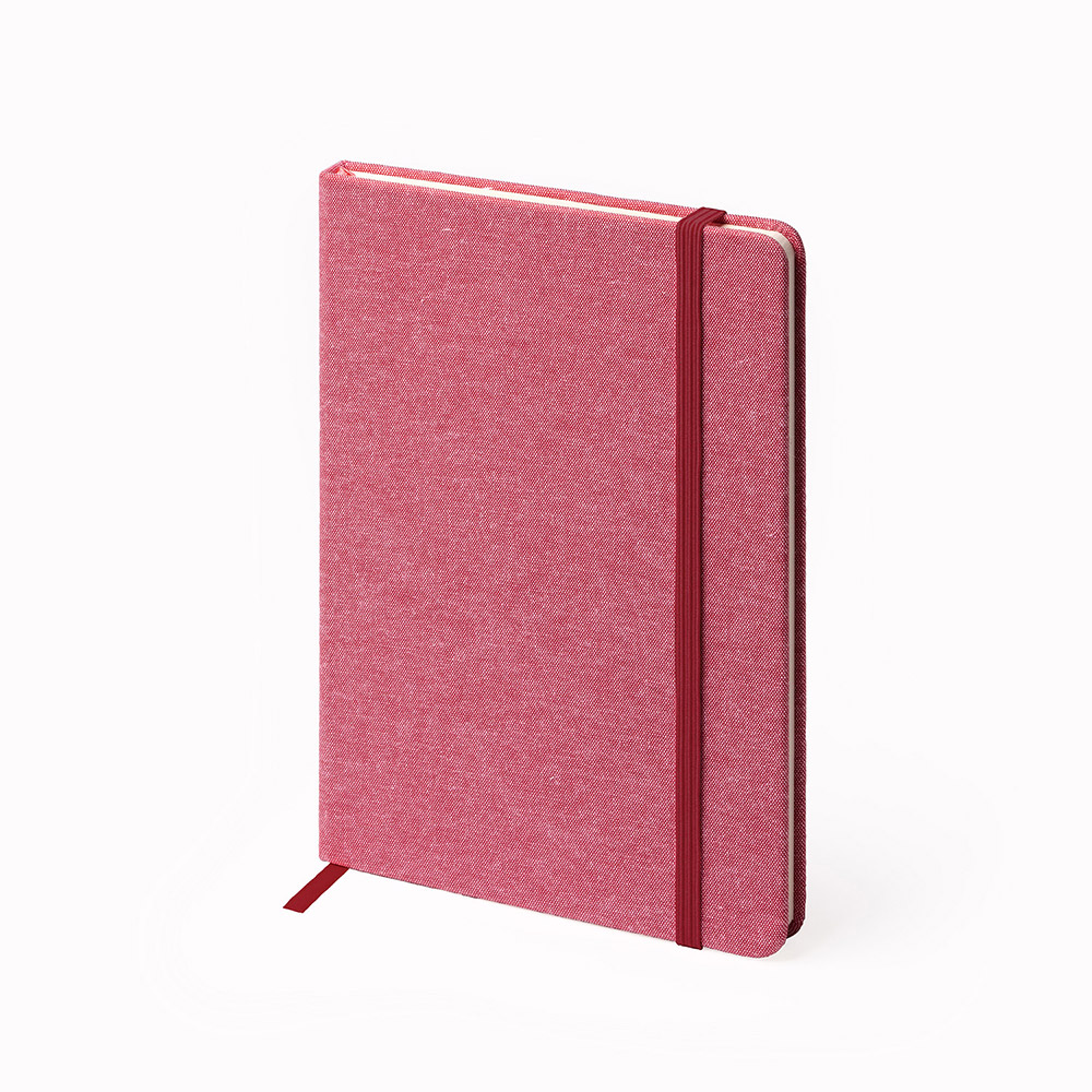 Bloc de notas A5 con tapas en algodón reciclado. Marcapáginas y banda elástica. 100 hojas lisas.