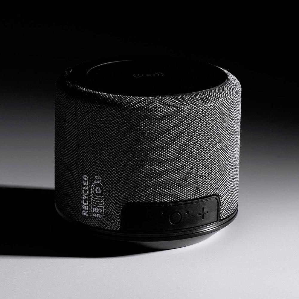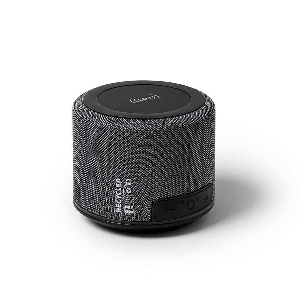 Altavoz inalámbrico con un bonito diseño realizado con tejido ecológico RPET y atractivo diseño. Base de carga inalámbrica (5W). Potencia 3W. Conexión Tipo C. Cable incluido.