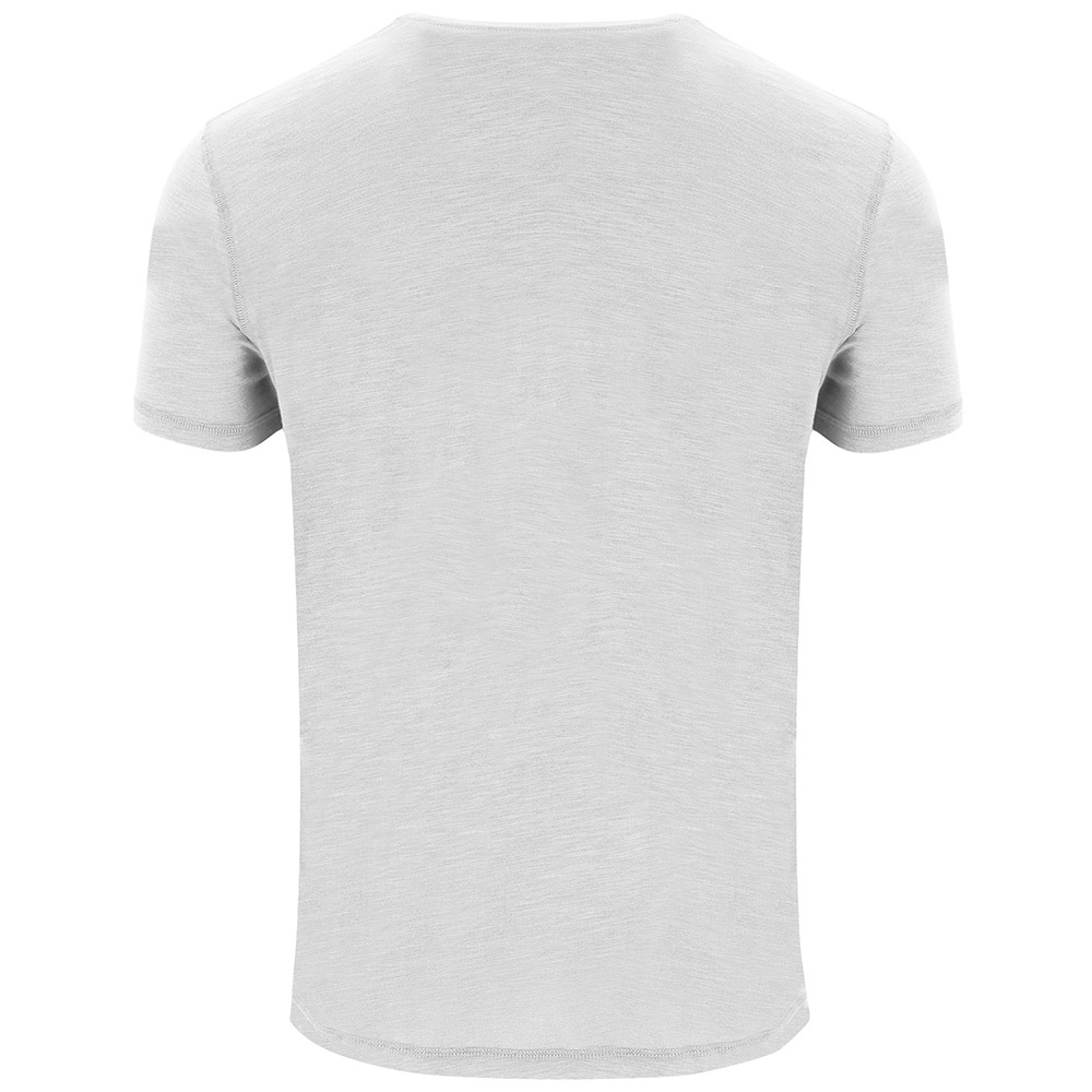 Camiseta de manga corta, en tejido vigoré inclinado. Cuello redondo del mismo tejido. Cubrecosturas interior a contraste de hombro a hombro. Costuras laterales remalladas de adorno. Bajo con aperturas laterales y el patronaje de la espalda es ligeramente más largo que el delantero.