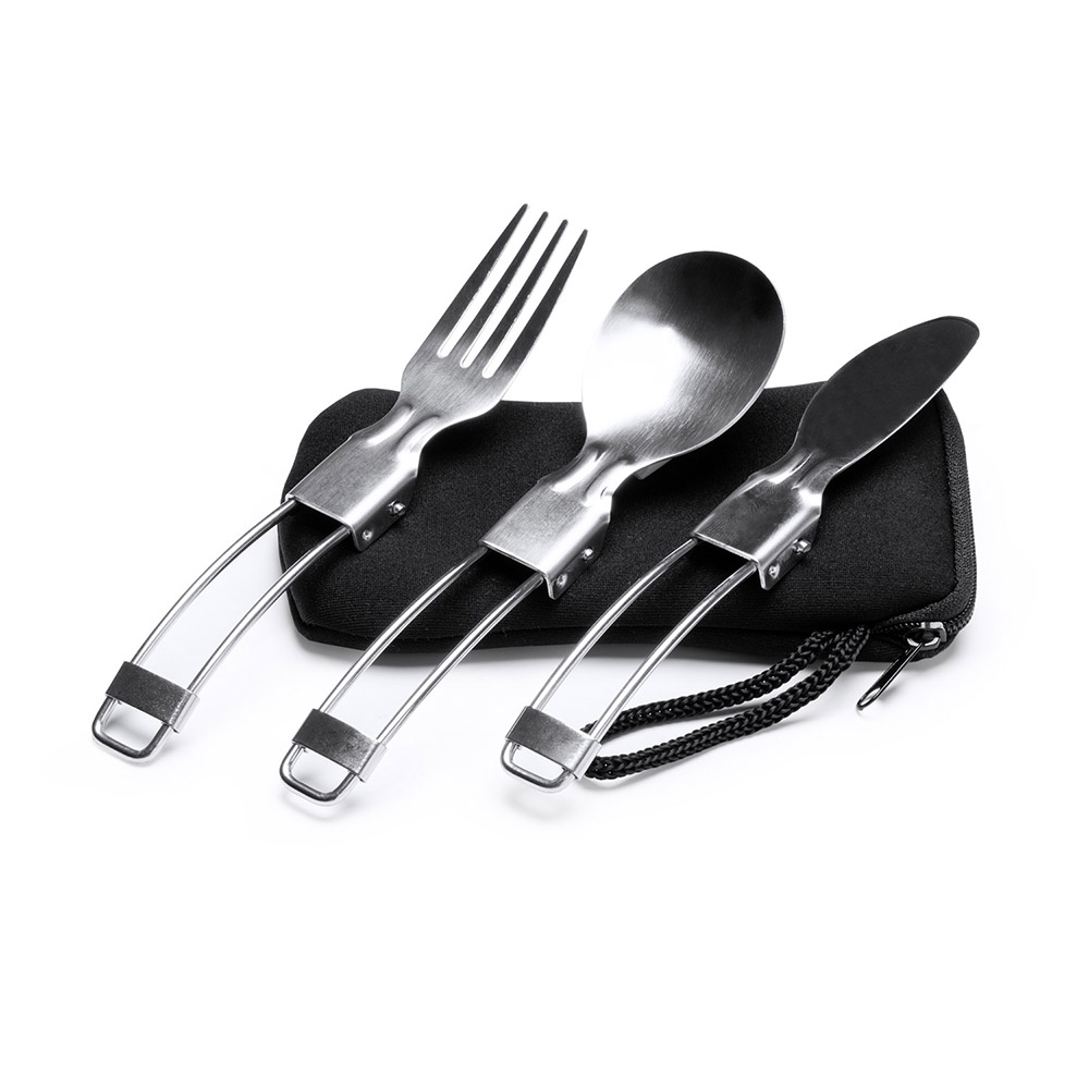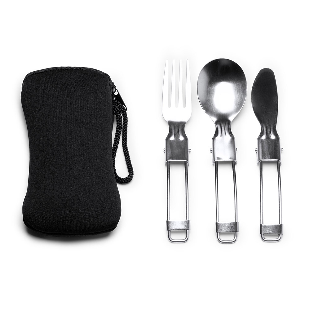 Set de cubiertos plegables de acero inoxidable con práctica funda de neopreno. Incluye tenedor, cuchillo y cuchara.