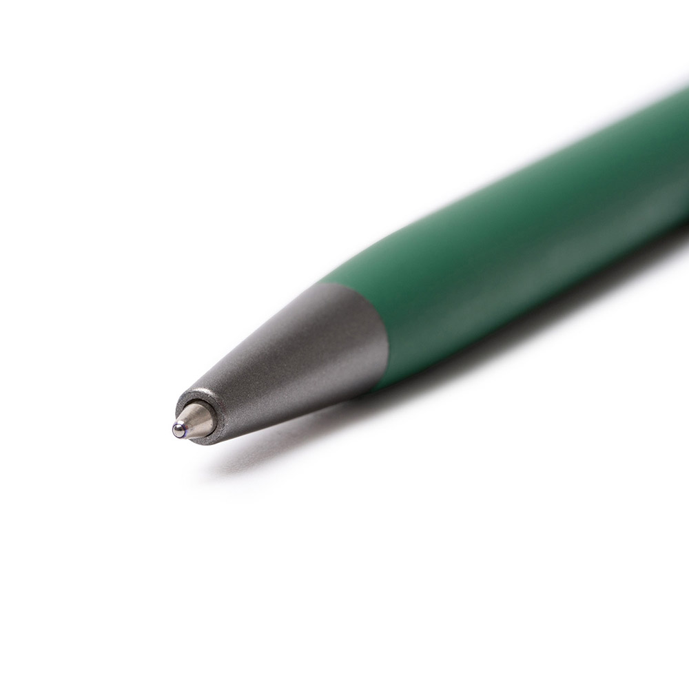 Bolígrafo pulsador con cuerpo de aluminio reciclado y detalles en acabado metálico mate. Tinta azul.