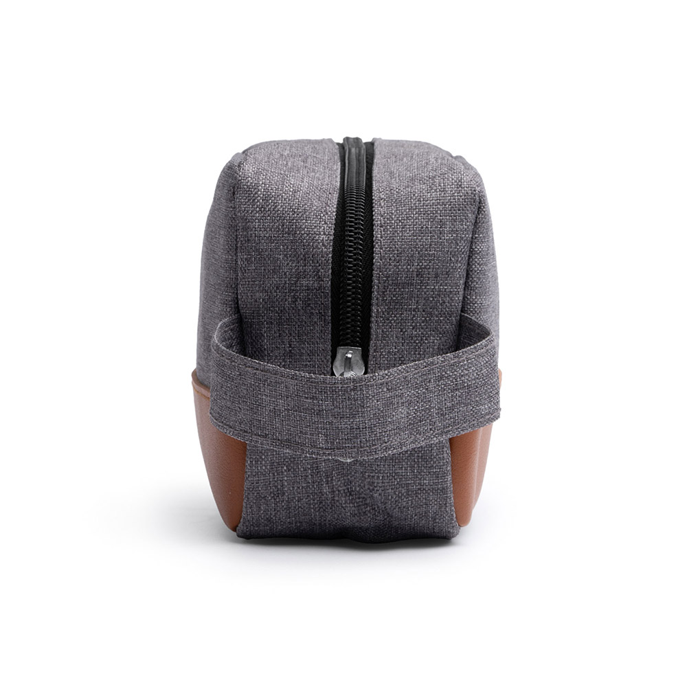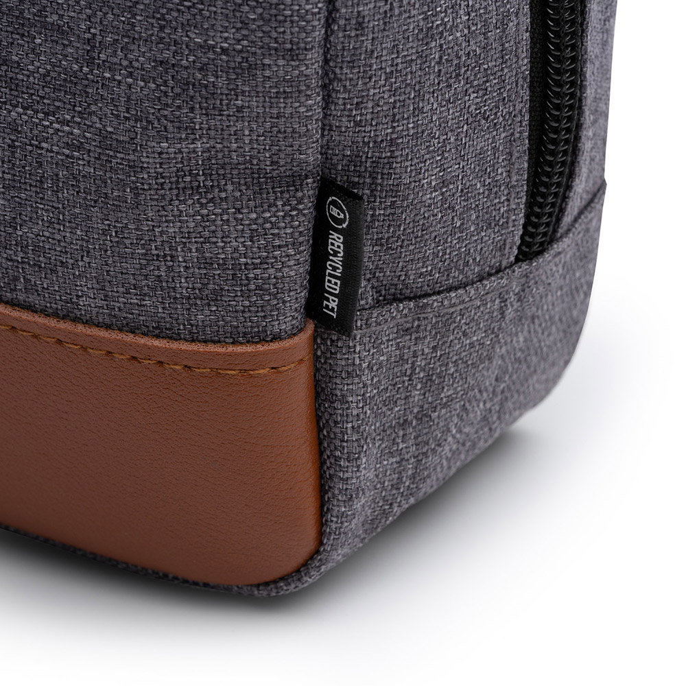 Neceser de poliéster reciclado RPET con detalles en PU Leather, ideal para marcaje. Incluye asa para transporte, combinando sostenibilidad y estilo. Transporta tus enseres de manerá cómoda y elegante.