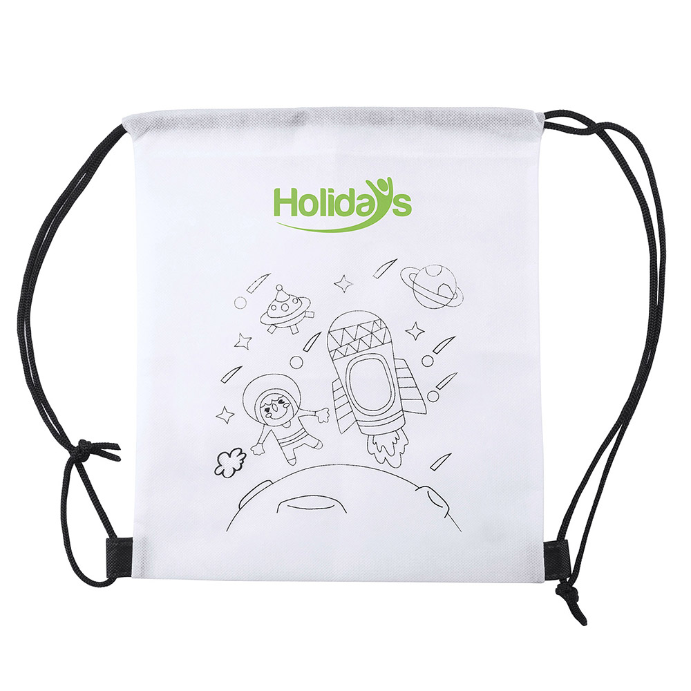 Mochila infantil de cuerdas realizada en non-woven, con diseño para colorear. Incluye 5 ceras en colores variados.